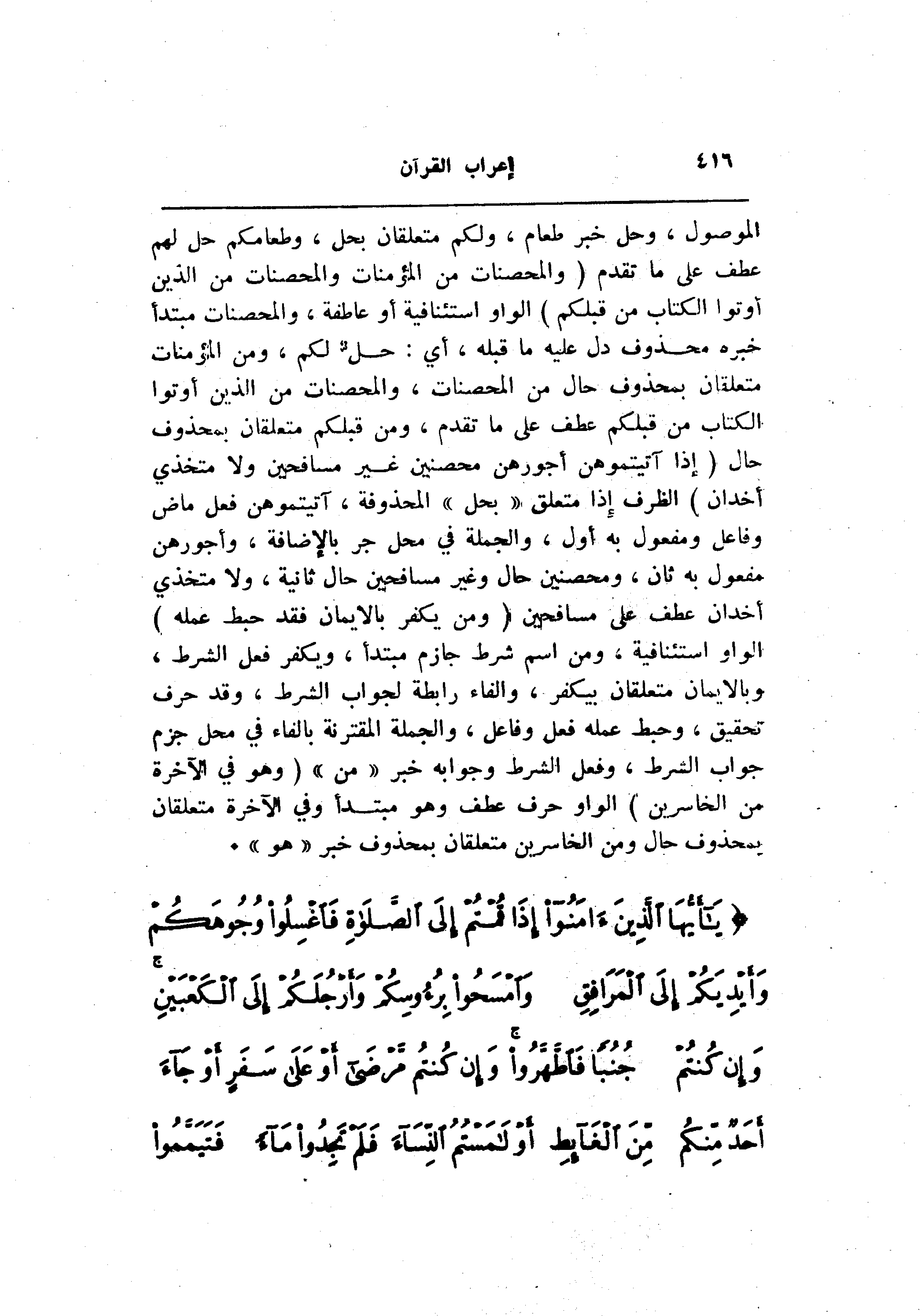 الموصول، وحل خبر طعام، ولكم متعلقان بحل، وطعامكم حل لهم عطف على ما تقدم (وَالْمُحْصَناتُ مِنَ الْمُؤْمِناتِ وَالْمُحْصَناتُ مِنَ الَّذِينَ أُوتُوا الْكِتابَ مِنْ قَبْلِكُمْ) الواو استئنافية أو عاطفة، والمحصنات مبتدأ خبره محذوف دل عليه ما قبله، أي: حلّ لكم، ومن المؤمنات متعلقان بمحذوف حال من المحصنات، والمحصنات من الذين أوتوا الكتاب من قبلكم عطف على ما تقدم، ومن قبلكم متعلقان بمحذوف حال (إِذا آتَيْتُمُوهُنَّ أُجُورَهُنَّ مُحْصِنِينَ غَيْرَ مُسافِحِينَ وَلا مُتَّخِذِي أَخْدانٍ) الظرف إذا متعلق «بحل» المحذوفة، آتيتموهن فعل ماض وفاعل ومفعول به أول، والجملة في محل جر بالإضافة، وأجورهن مفعول به ثان، ومحصنين حال وغير مسافحين حال ثانية، ولا متخذي أخدان عطف على مسافحين (وَمَنْ يَكْفُرْ بِالْإِيمانِ فَقَدْ حَبِطَ عَمَلُهُ) الواو استئنافية، ومن اسم شرط جازم مبتدأ، ويكفر فعل الشرط، وبالايمان متعلقان بيكفر، والفاء رابطة لجواب الشرط، وقد حرف تحقيق، وحبط عمله فعل وفاعل، والجملة المقترنة بالفاء في محل جزم جواب الشرط، وفعل الشرط وجوابه خبر «من» (وَهُوَ فِي الْآخِرَةِ مِنَ الْخاسِرِينَ) الواو حرف عطف وهو مبتدأ وفي الآخرة متعلقان بمحذوف حال ومن الخاسرين متعلقان بمحذوف خبر «هو» .