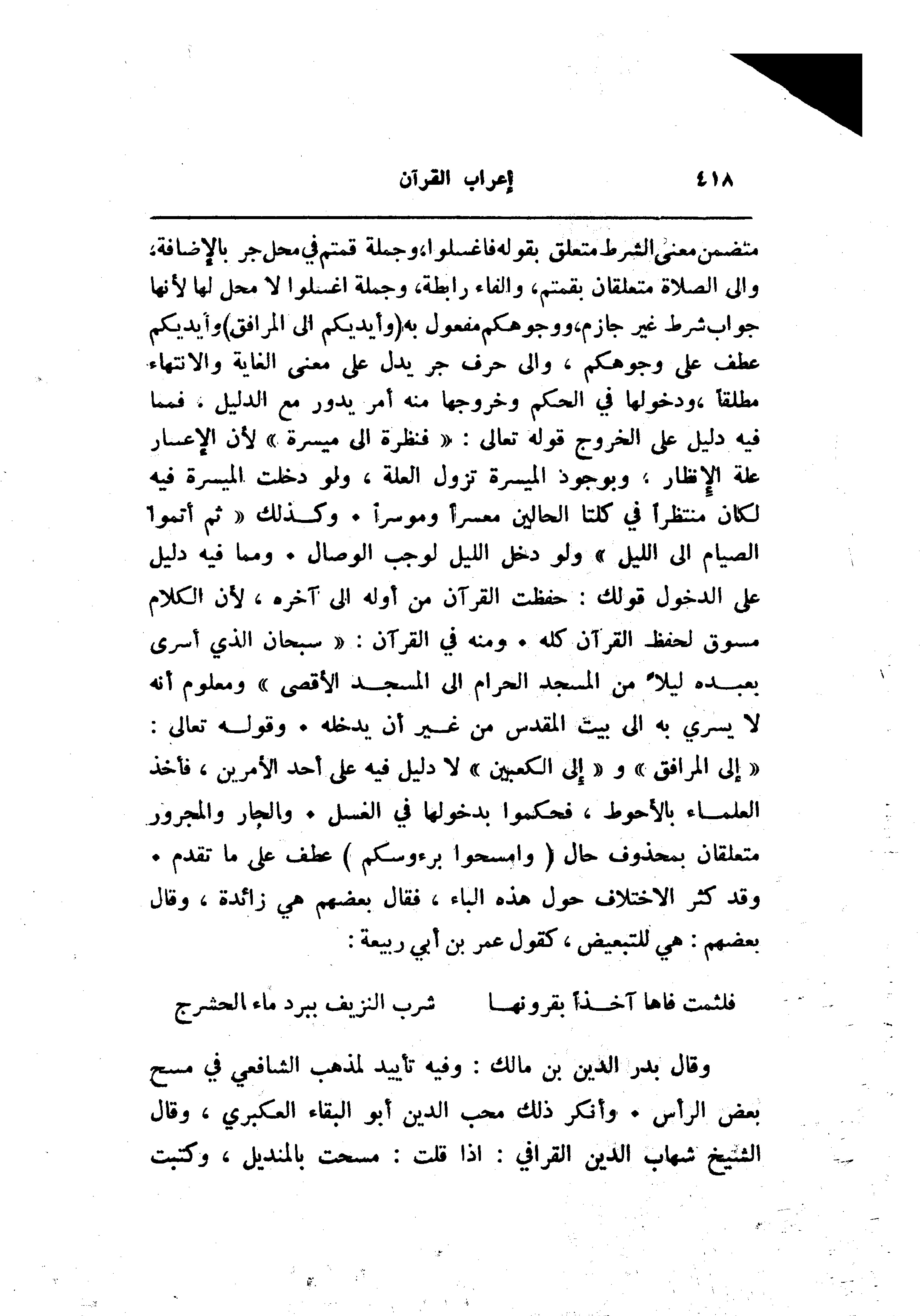 وقال بدر الدين بن مالك: وفيه تأييد لمذهب الشافعي في مسح بعض الرأس. وأنكر ذلك محب الدين أبو البقاء العكبري، وقال الشيخ شهاب الدين القرافي: إذا قلت: مسحت بالمنديل، وكتبت
