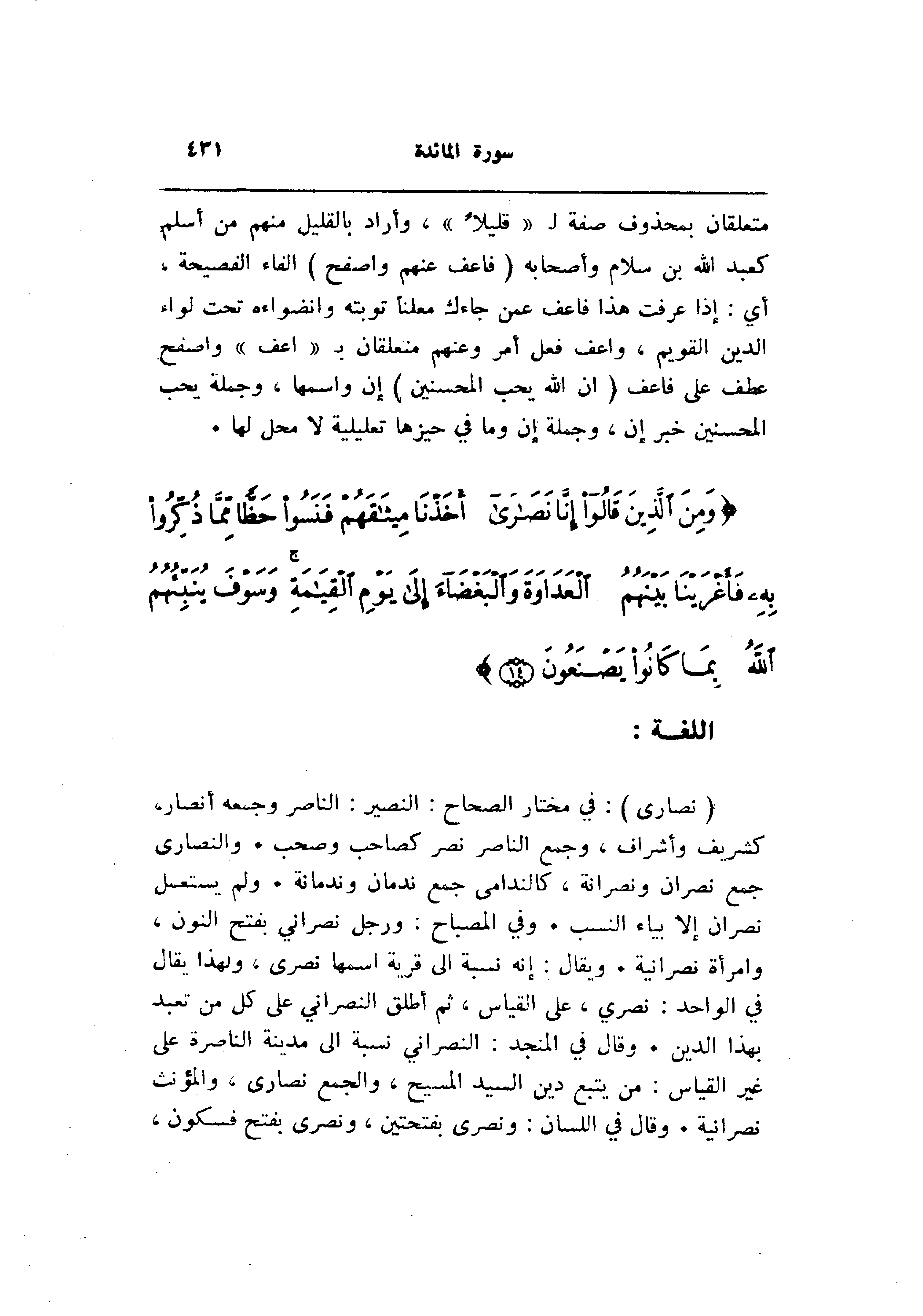 متعلقان بمحذوف صفة ل «قليلا» ، وأراد بالقليل منهم من أسلم كعبد الله بن سلام وأصحابه (فَاعْفُ عَنْهُمْ وَاصْفَحْ) الفاء الفصيحة، أي: إذا عرفت هذا فاعف عمن جاءك معلنا توبته وانضواءه تحت لواء الدين القويم، واعف فعل أمر وعنهم متعلقان ب «اعف» واصفح عطف على فاعف (إِنَّ اللَّهَ يُحِبُّ الْمُحْسِنِينَ) إن واسمها، وجملة يحب المحسنين خبر إن، وجملة إن وما في حيزها تعليلية لا محل لها.