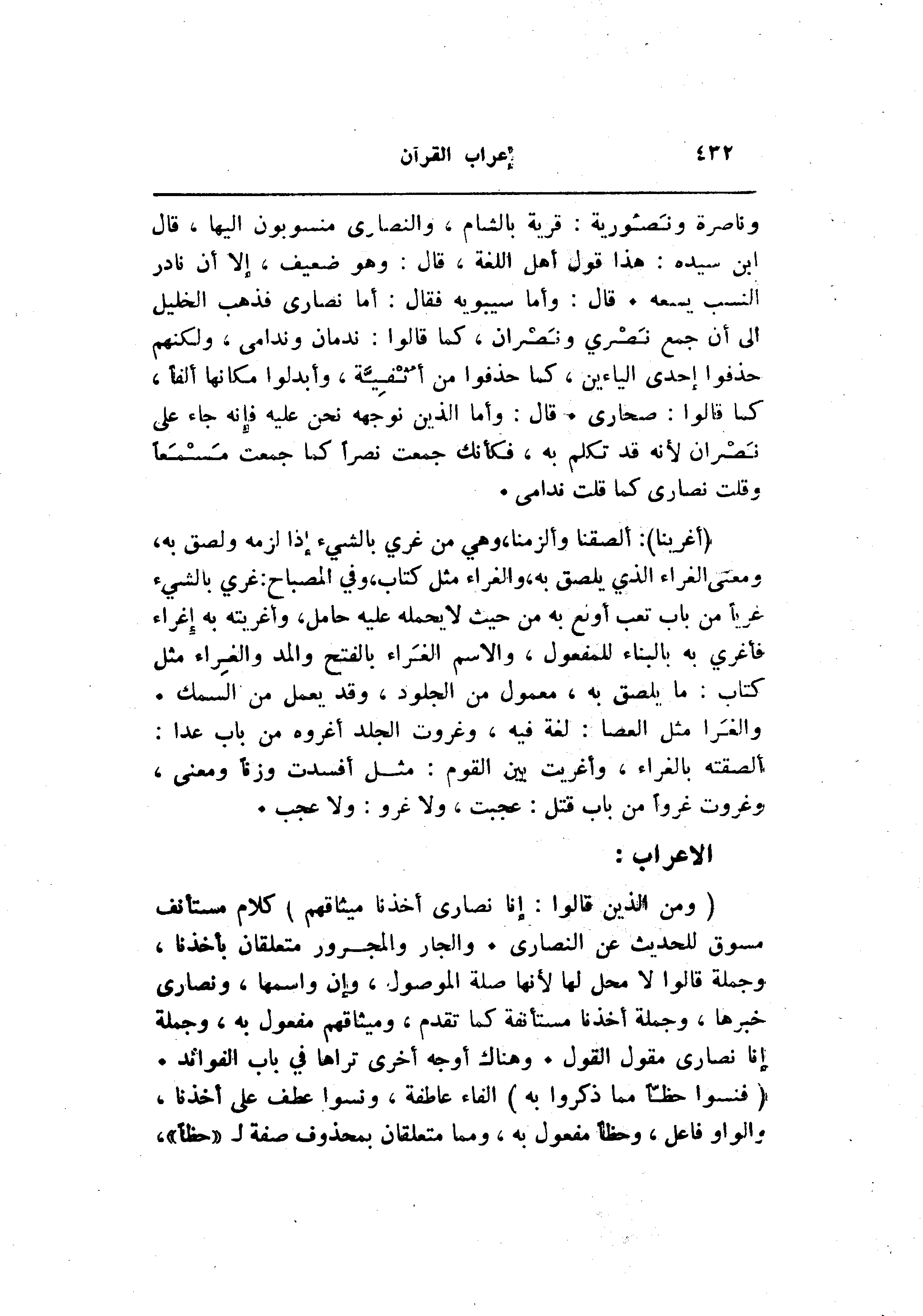 وناصرة ونصورية: قرية بالشام، والنصارى منسوبون إليها، قال ابن سيده: هذا قول أهل اللغة، قال: وهو ضعيف، إلا أن نادر النسب يسعه. قال: وأما سيبويه فقال: أما نصارى فذهب الخليل الى أن جمع نصري ونصران، كما قالوا: ندمان وندامى، ولكنهم حذفوا إحدى الياءين، كما حذفوا من أثفيّة، وأبدلوا مكانها ألفا، كما قالوا: صحارى. قال: وأما الذين نوجهه نحن عليه فإنه جاء على نصران لأنه قد تكلم به، فكأنك جمعت نصرا كما جمعت مسمعا وقلت نصارى كما قلت ندامى.