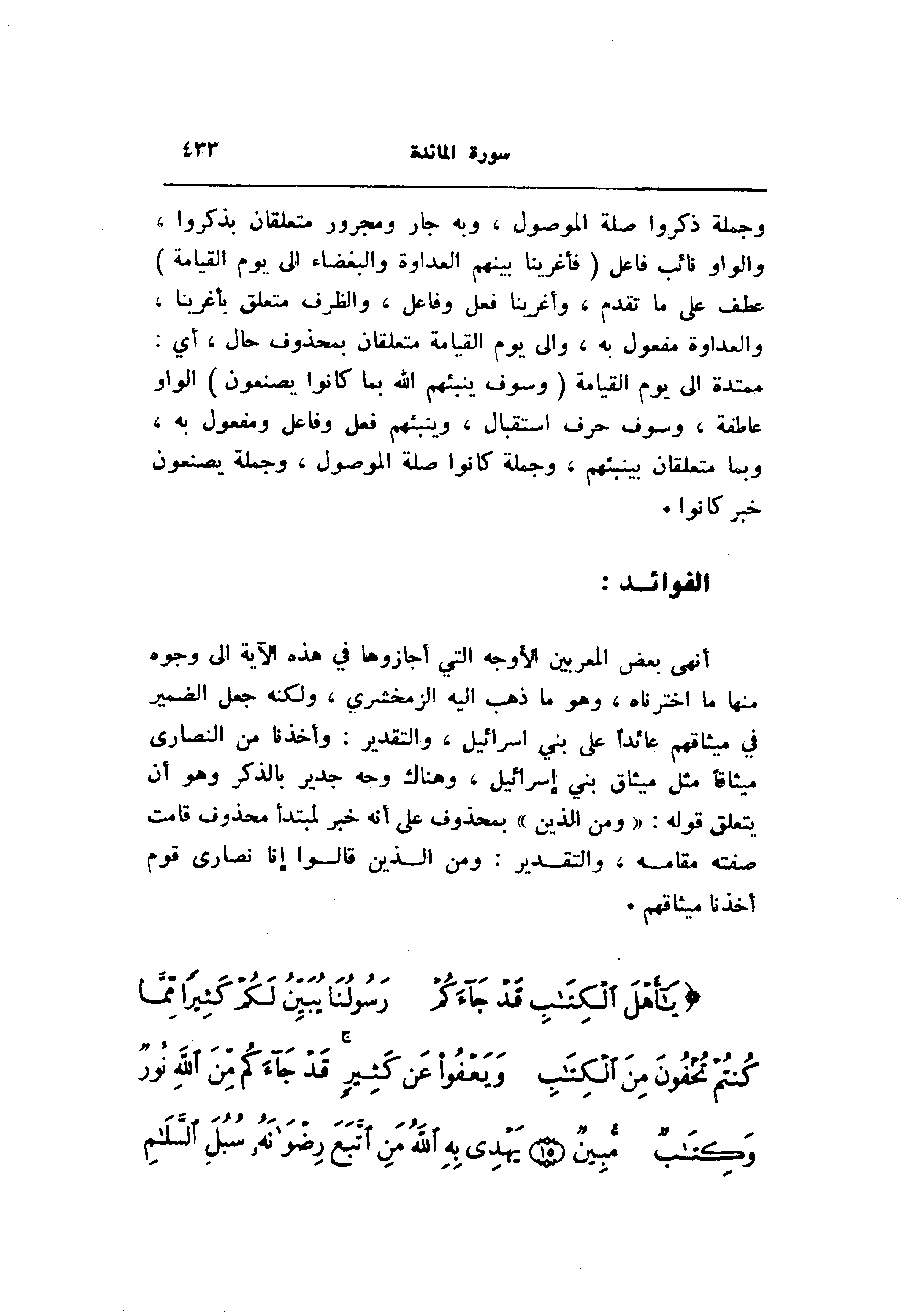 أنهى بعض المعربين الأوجه التي أجازوها في هذه الآية الى وجوه منها ما اخترناه، وهو ما ذهب اليه الزمخشري، ولكنه جعل الضمير في ميثاقهم عائدا على بني إسرائيل، والتقدير: وأخذنا من النصارى ميثاقا مثل ميثاق بني إسرائيل، وهناك وجه جدير بالذكر وهو أن يتعلق قوله: «ومن الذين» بمحذوف على أنه خبر لمبتدأ محذوف قامت صفته مقامه، والتقدير: ومن الذين قالوا إنا نصارى قوم أخذنا ميثاقهم.