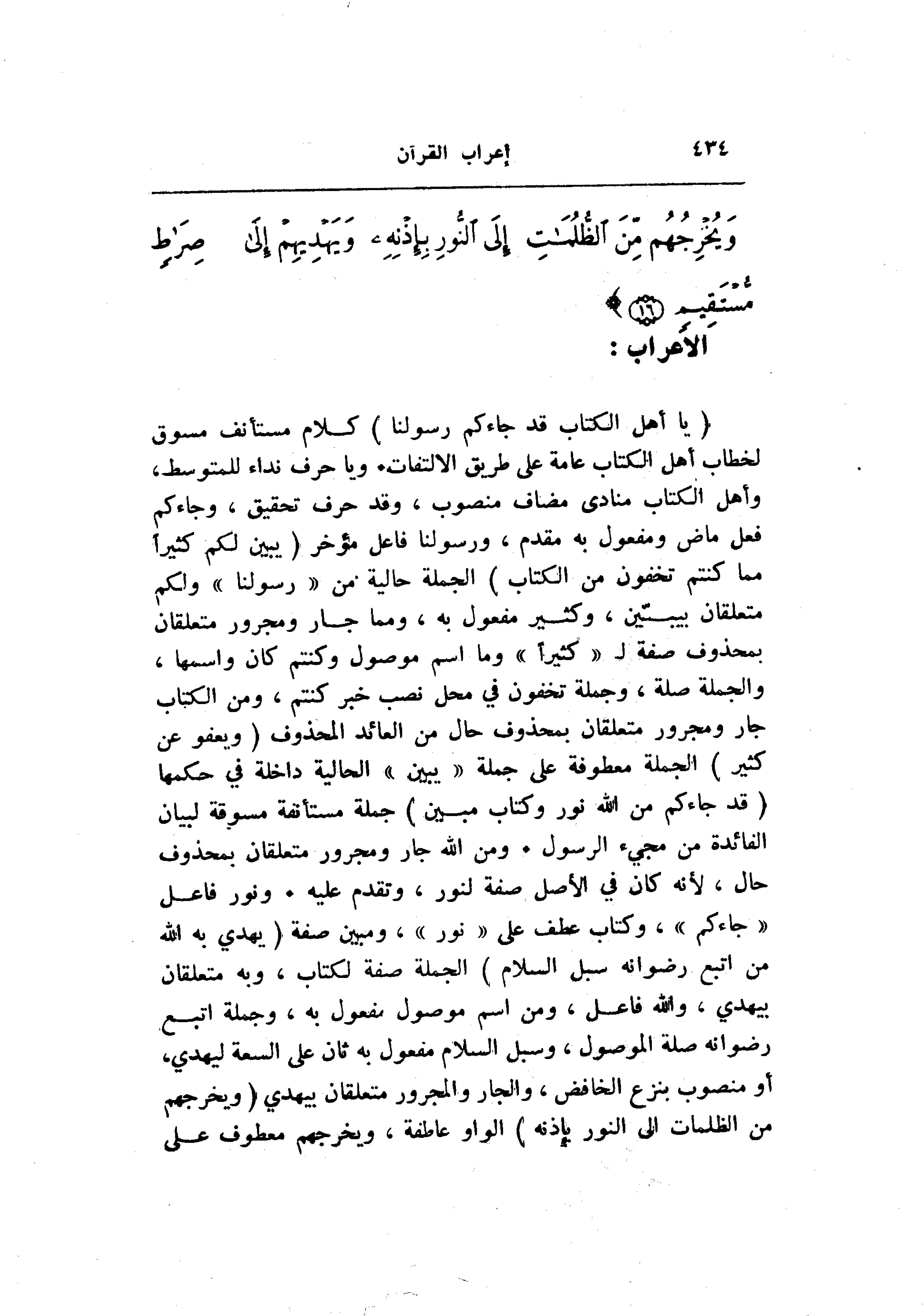 (يا أَهْلَ الْكِتابِ قَدْ جاءَكُمْ رَسُولُنا) كلام مستأنف مسوق لخطاب أهل الكتاب عامة على طريق الالتفات. ويا حرف نداء للمتوسط، وأهل الكتاب منادى مضاف منصوب، وقد حرف تحقيق، وجاءكم فعل ماض ومفعول به مقدم، ورسولنا فاعل مؤخر (يُبَيِّنُ لَكُمْ كَثِيراً مِمَّا كُنْتُمْ تُخْفُونَ مِنَ الْكِتابِ) الجملة حالية من «رسولنا» ولكم متعلقان بيبيّن، وكثير مفعول به، ومما جار ومجرور متعلقان بمحذوف صفة ل «كثيرا» وما اسم موصول وكنتم كان واسمها، والجملة صلة، وجملة تخفون في محل نصب خبر كنتم، ومن الكتاب جار ومجرور متعلقان بمحذوف حال من العائد المحذوف (وَيَعْفُوا عَنْ كَثِيرٍ) الجملة معطوفة على جملة «يبين» الحالية داخلة في حكمها (قَدْ جاءَكُمْ مِنَ اللَّهِ نُورٌ وَكِتابٌ مُبِينٌ) جملة مستأنفة مسوقة لبيان الفائدة من مجيء الرسول. ومن الله جار ومجرور متعلقان بمحذوف حال، لأنه كان في الأصل صفة لنور، وتقدم عليه. ونور فاعل «جاءكم» ، وكتاب عطف على «نور» ، ومبين صفة (يَهْدِي بِهِ اللَّهُ مَنِ اتَّبَعَ رِضْوانَهُ سُبُلَ السَّلامِ) الجملة صفة لكتاب، وبه متعلقان بيهدي، والله فاعل، ومن اسم موصول مفعول به، وجملة اتبع رضوانه صلة الموصول، وسبل السلام مفعول به ثان على السعة ليهدي، أو منصوب بنزع الخافض، والجار والمجرور متعلقان بيهدي (وَيُخْرِجُهُمْ مِنَ الظُّلُماتِ إِلَى النُّورِ بِإِذْنِهِ) الواو عاطفة، ويخرجهم معطوف على