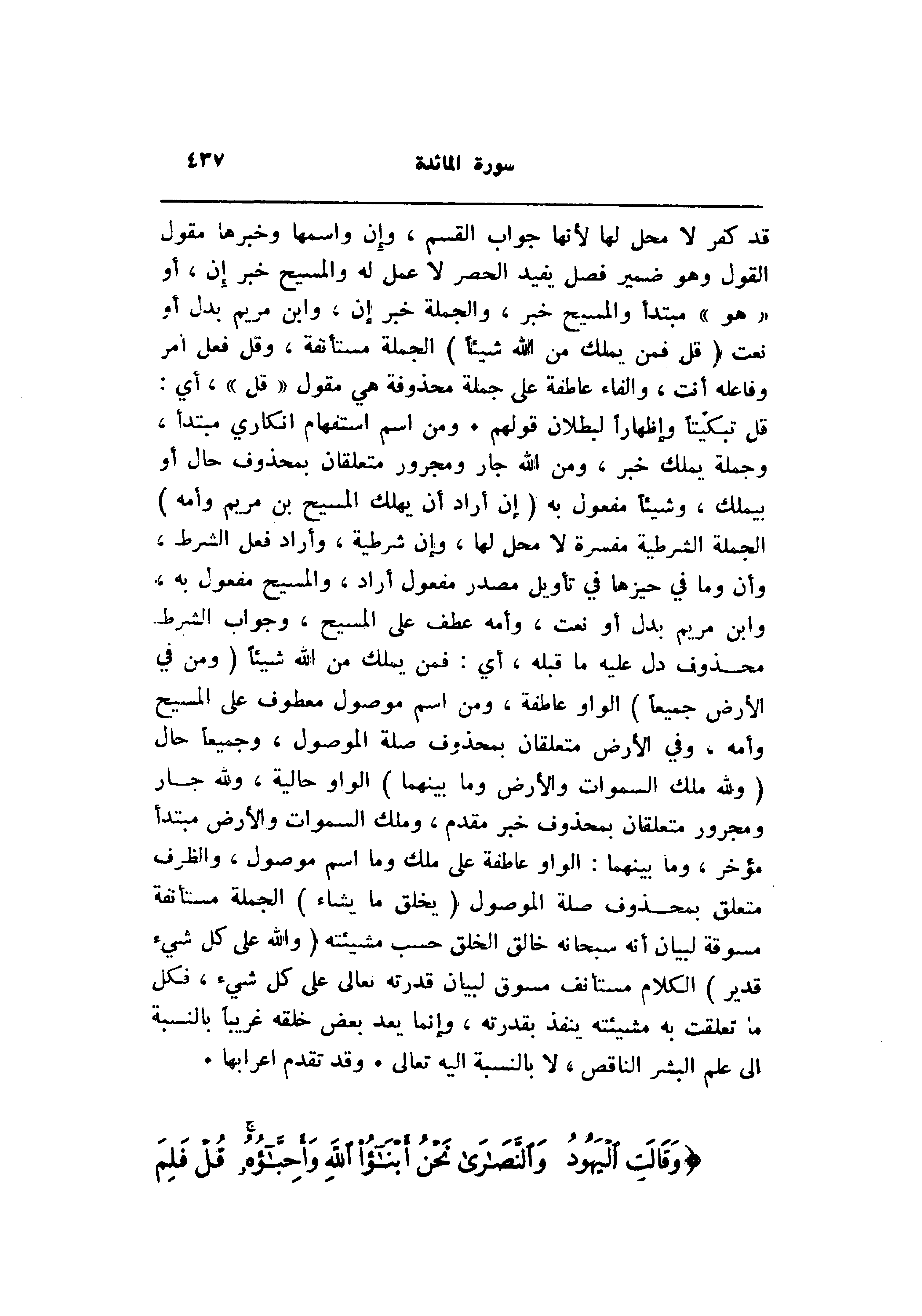 قد كفر لا محل لها لأنها جواب القسم، وإن واسمها وخبرها مقول القول وهو ضمير فصل يفيد الحصر لا عمل له والمسيح خبر إن، أو «هو» مبتدأ والمسيح خبر، والجملة خبر إن، وابن مريم بدل أو نعت (قُلْ فَمَنْ يَمْلِكُ مِنَ اللَّهِ شَيْئاً) الجملة مستأنفة، وقل فعل أمر وفاعله أنت، والفاء عاطفة على جملة محذوفة هي مقول «قل» ، أي: