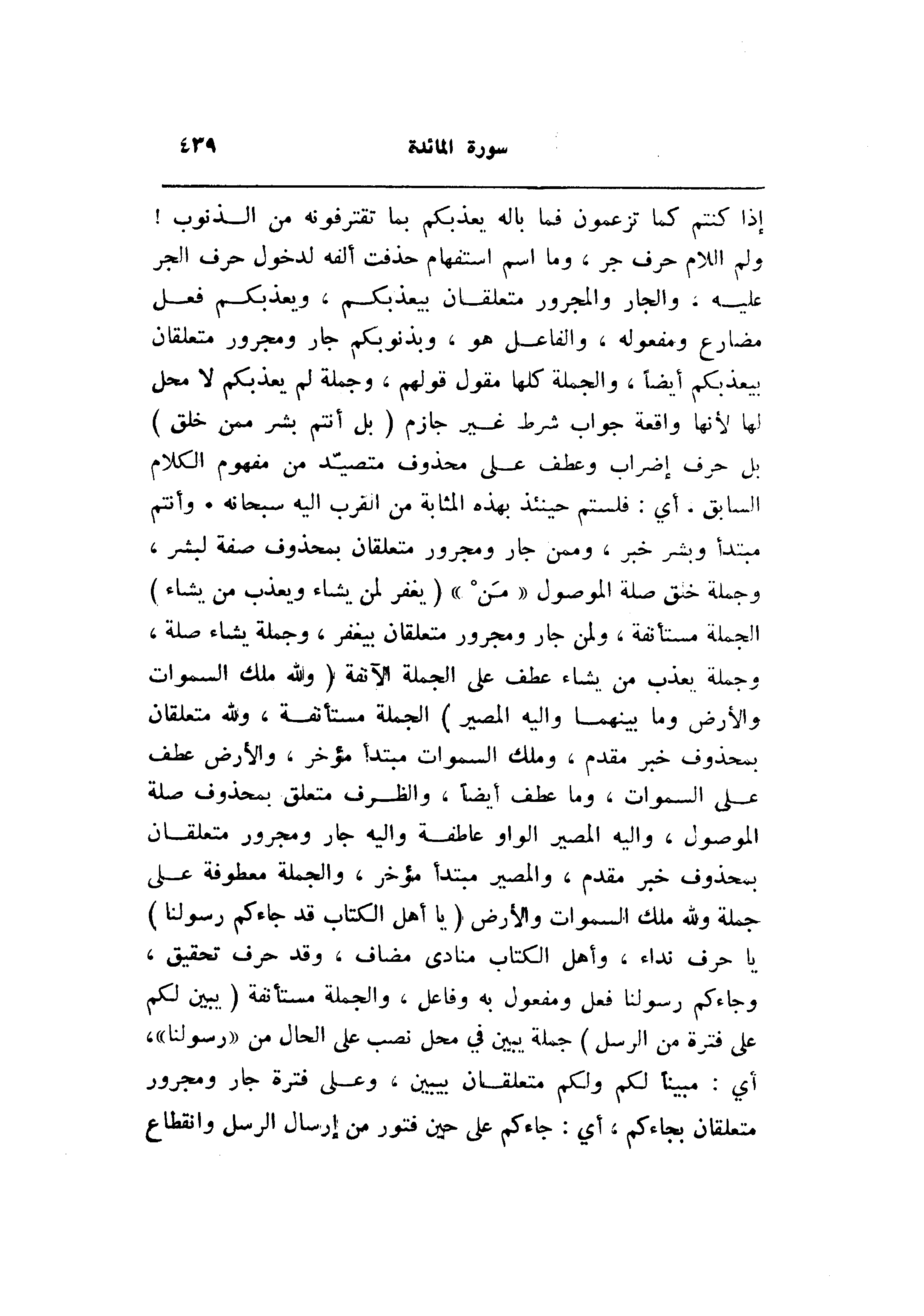 إذا كنتم كما تزعمون فما باله يعذبكم بما تقترفونه من الذنوب! ولم اللام حرف جر، وما اسم استفهام حذفت ألفه لدخول حرف الجر عليه، والجار والمجرور متعلقان بيعذبكم، ويعذبكم فعل مضارع ومفعوله، والفاعل هو، وبذنوبكم جار ومجرور متعلقان بيعذبكم أيضا، والجملة كلها مقول قولهم، وجملة لم يعذبكم لا محل لها لأنها واقعة جواب شرط غير جازم (بَلْ أَنْتُمْ بَشَرٌ مِمَّنْ خَلَقَ) بل حرف إضراب وعطف على محذوف متصيّد من مفهوم الكلام السابق. أي: فلستم حينئذ بهذه المثابة من القرب اليه سبحانه. وأنتم مبتدأ وبشر خبر، وممن جار ومجرور متعلقان بمحذوف صفة لبشر، وجملة خلق صلة الموصول «من» (يَغْفِرُ لِمَنْ يَشاءُ وَيُعَذِّبُ مَنْ يَشاءُ) الجملة مستأنفة، ولمن جار ومجرور متعلقان بيغفر، وجملة يشاء صلة، وجملة يعذب من يشاء عطف على الجملة الآنفة (وَلِلَّهِ مُلْكُ السَّماواتِ وَالْأَرْضِ وَما بَيْنَهُما وَإِلَيْهِ الْمَصِيرُ) الجملة مستأنفة، ولله متعلقان بمحذوف خبر مقدم، وملك السموات مبتدأ مؤخر، والأرض عطف على السموات، وما عطف أيضا، والظرف متعلق بمحذوف صلة الموصول، واليه المصير الواو عاطفة واليه جار ومجرور متعلقان بمحذوف خبر مقدم، والمصير مبتدأ مؤخر، والجملة معطوفة على جملة ولله ملك السموات والأرض (يا أَهْلَ الْكِتابِ قَدْ جاءَكُمْ رَسُولُنا) يا حرف نداء، وأهل الكتاب منادى مضاف، وقد حرف تحقيق، وجاءكم رسولنا فعل ومفعول به وفاعل، والجملة مستأنفة (يُبَيِّنُ لَكُمْ عَلى فَتْرَةٍ مِنَ الرُّسُلِ) جملة يبين في محل نصب على الحال من «رسولنا» ، أي: مبينا لكم ولكم متعلقان بيبين، وعلى فترة جار ومجرور متعلقان بجاءكم، أي: جاءكم على حين فتور من إرسال الرسل وانقطاع