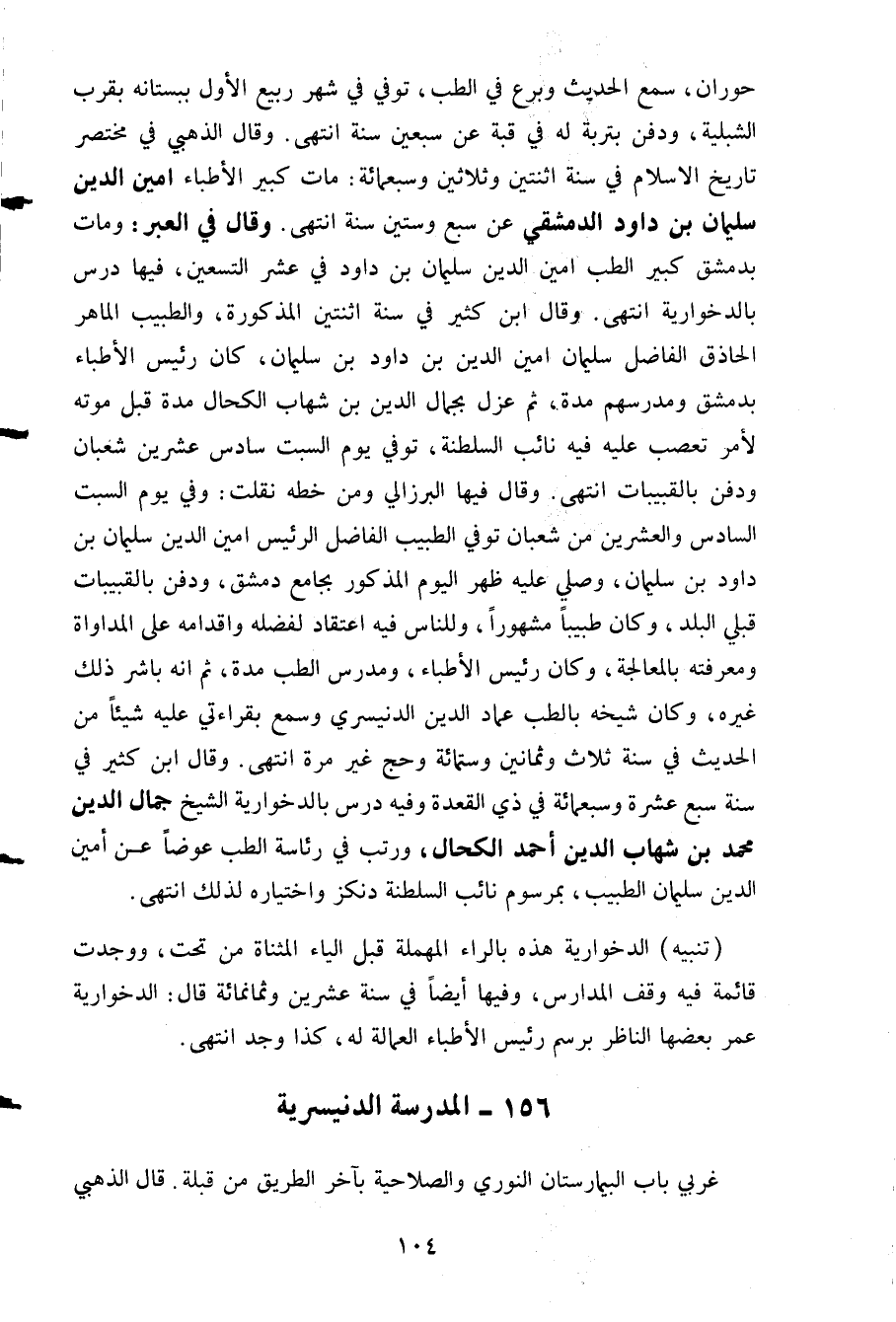 حوران سمع الحديث وبرع في الطب توفي في شهر ربيع الأول ببست أنه بقرب الشبلية ودفن بتربة له في قبة عن سبعين سنة انتهى. وقال الذهبي في مختصر تاريخ الإسلام في سنة اثنتين وثلاثين وسبعمائة: مات كبير الأطباء أمين الدين سليمان بن داود الدمشقي عن سبع وستين سنة انتهى. وقال في العبر: ومات بدمشق كبير الطب أمين الدين سليمان بن داود في عشر التسعين فيها درس بالدخوارية انتهى. وقال ابن كثير في سنة اثنتين المذكورة: والطبيب الماهر الحاذق الفاضل سليمان أمين الدين بن داود بن سليمان كان رئيس الأطباء بدمشق ومدرسهم مدة ثم عزل بجمال الدين بن شهاب الكحال مدة قبل موته لامر تعصب عليه فيه نائب السلطنة توفي يوم السبت سادس عشرين شعبان ودفن بالقبيبات انتهى. وقال فيها البرزالي: ومن خطه نقلت وفي يوم السبت سادس عشرين شعبان ودفن بالقبيات انتى وقال فيها البرزالي ومن خطة نقلت: وفي يوم السبت السادس والعشرين من شعبان توفي الطبيب الفاضل الرئيس أمين الدين سليمان بن داود بن سليمان وصلي عليه ظهر اليوم المذكور بجامع دمشق ودفن بالقبيبات قبلي البلد وكان طبيبا مشهورا وللناس فيه اعتقاد لفضله واقدامه على المداوة ومعرفته بالمعالجة وكان رئيس الأطباء ومدرس الطب مدة ثم إنه باشر ذلك غيره وكان شيخه بالطب عماد الدين الدنيسري وسمع بقراءتي عليه شيئا من الحديث في سنة ثلاث وثمانين وستمائة وحج غير مرة انتهى. وقال ابن كثير في سنة سبع عشرة وسبعمائة: في ذي القعدة وفيه درس بالدخوارية الشيخ جمال الدين محمد بن شهاب الدين أحمد الكحال ورتب في رئاسة الطب عوضا عن أمين الدين سليمان الطبيب بمرسوم نائب السلطنة دنكز وأختياره لذلك انتهى.