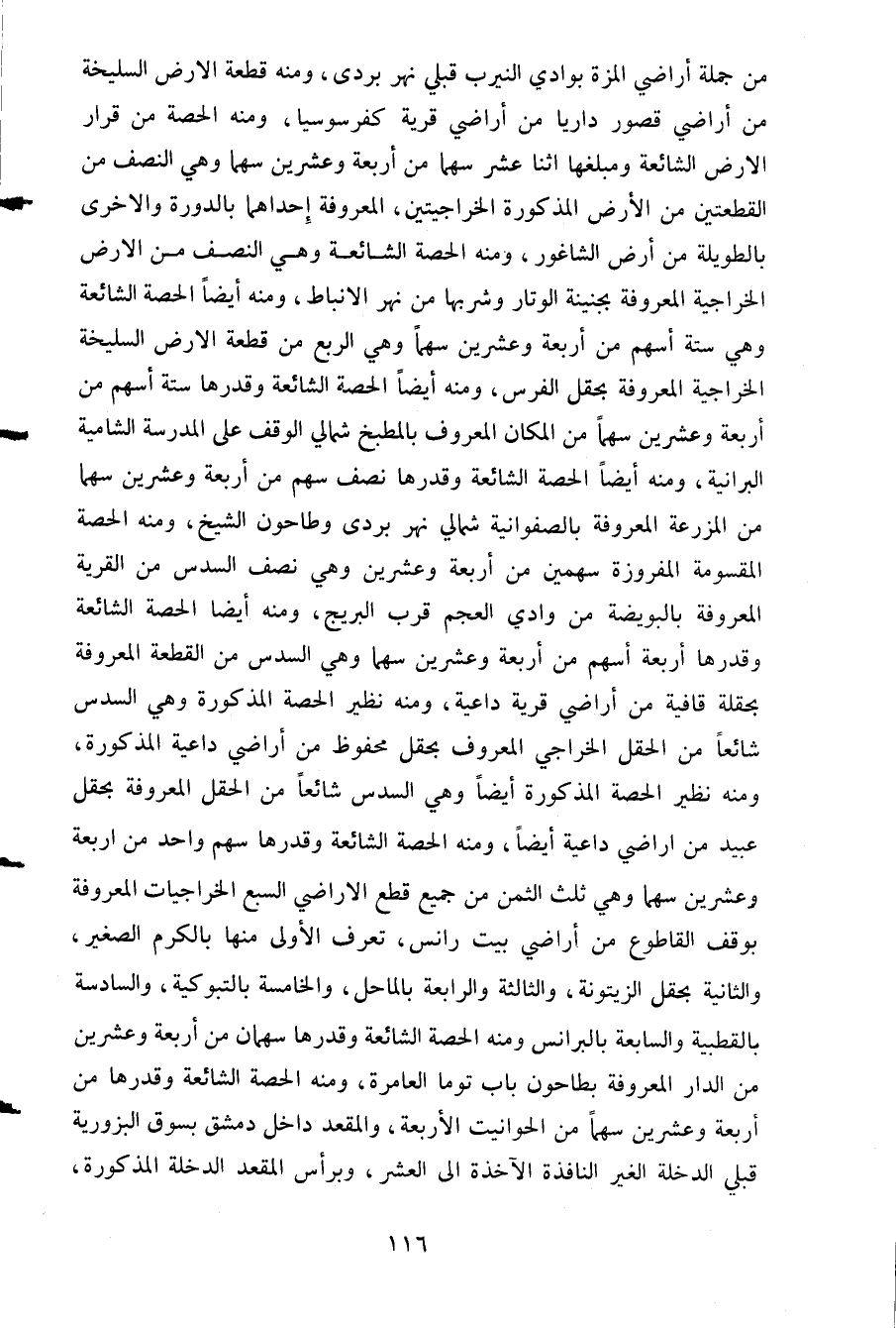 من جملة أراضي المزة بوادي النيرب قبلي نهر بردى ومنه قطعة الأرض السليخه من أراضي قصور داريا من أراضي قرية كفر سوسيا ومنه الحصة من قرار الأرض الشائعة ومبلغها اثنا عشر سهما من أربعة وعشرين سهما وهي النصف من القطعتين من الأرض المذكورة الخراجيتين المعروفه احداهما بالدورة والآخرى بالطويلة من أرض الشاغور ومنه الحصه الشائعة وهي النصف من الأرض الخراجية المعروفة بجنينة الوتار وشربها من نهر الانباط ومنه أيضا الحصة الشائعة وهي ستة أسهم من أربعة وعشرين سهما وهي الربع من قطعة الأرض السليخة الخراجية المعروفة بحقل الفرس ومنه أيضا الحصة الشائعة وقدرها ستة أسهم من أربعة وعشرين سهما من المكان المعروف بالمطبخ شمالي الوقف على المدرسة الشامية البرانيه ومنه أيضا الحصة الشائعة وقدرها نصف سهم من أربعة وعشرين سهما من المزرعة المعروفة بالصفوانية شمالي نهر بردى وطاحون الشيخ ومنه الحصة المقسومة المفروزة سهمين من أربعة وعشرين وهي نصف السدس من القرية المعروفة بالبويضة من وادي العجم قرب البريج ومنه أيضا الحصة الشائعة وقدرها أربعة أسهم من أربعة وعشرين سهما وهي السدس من القطعة المعروفة بحلقة قافية من أراضي قرية داعية ومنه نظير الحصة المذكورة وهي السدس شائعة من الحقل الخراجي المعروف بحقل محفوظ من أراضي داعية المذكورة ومنه نظير الحصة المذكورة أيضا وهي السدس شائعا من الحقل المعروفه بحقل عبيد من أراضي داعية أيضا ومنه الحصة الشائعة وقدرها سهم واحد من أربعة وعشرين سهما وهي ثلث الثمن من جميع قطع الأراضي السبع الخراجيات المعروفة بوقف القاطوع من أراضي بيت رانس تعرف الأولى منها بالكرم الصغير والثانية بحقل الزيتونة والثالثه بالماحل والخامسة بالتبوكية والسادسة بالقطبية والسابعة بالبرانس ومنه الحصة الشائعة وقدرها سهمان من أربعة وعشرين من الدار المعروفة بطاحون باب توما العامرة ومنه الحصة الشائعة وقدرها من أربعة وعشرين سهما من الحوانيت الأربعة والمقعد داخل دمشق بسوق البزورية قبلي الدخلة الغير النافذة الآخذه إلى العشر وبرأس المقعد الدخله المذكورة