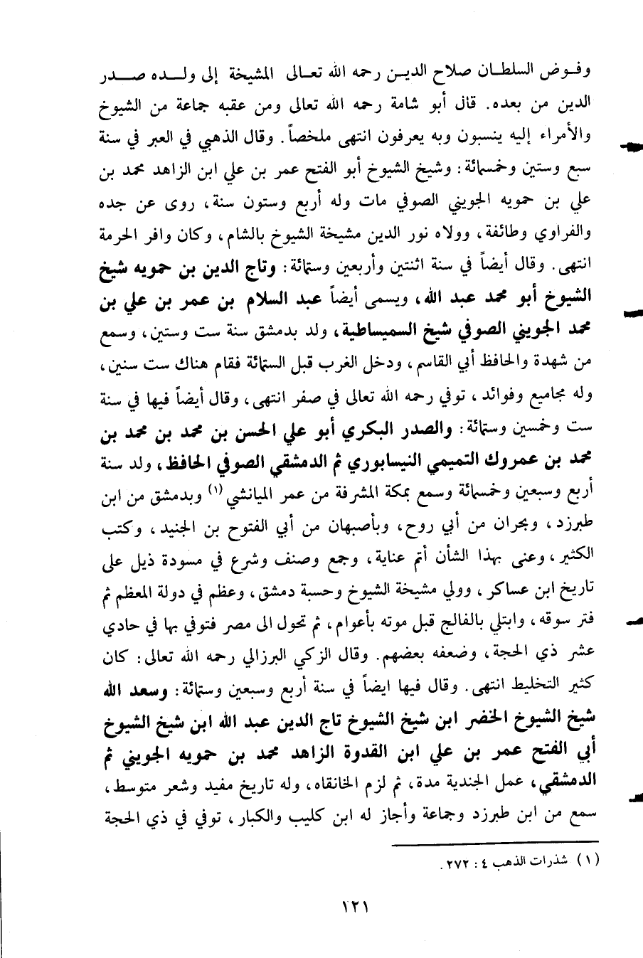 وفوض السلطان صلاح الدين رحمه الله تعالى المشيخة الى ولده صدر الدين من بعده قال ابو شامه رحمه الله تعالى ومن عقبة جماعة من الشيوخ والامراء اليه ينسبون وبه يعرفون انتهى ملخصا وقال الذهبي في العبر في سنة سبع وستين وخمسمائة وشيخ الشيوخ ابو الفتح عمر بن علي ابن الزاهد محمد بن علي بن حموية الجويني الصوفي مات وله اربع وستون سنة روى عن جده والفراوي وطائفة وولاه نور الدين مشيخة الشيوخ بالشام وكان وافر الحرمة انتهى وقال ايضا في سنة اثنتين واربعين وستمائة وتاج الدين بن حموية شيخ الشيوخ ابو محمد عبد الله ويسمى ايضا عبد السلام بن عمر بن علي بن محمد الجويني الصوفي شيخ السميساطية ولد بدمشق سنة ست وستين وسمع من شهدة والحافظ ابي القاسم ودخل الغرب قبل الستمائة فقام هناك ست سنين وله مجاميع وفوائد توفي رحمه الله تعالى في صفر انتهى وقال ايضا في سنة ست وخمسين وستمائة والصدر البكري ابو علي الحسن بن محمد بن محمد بن محمد بن عمروك التميمي النيسابوري ثم الدمشقي الصوفي الحافظ ولد سنة اربع وسبعين وخمسمائة وسمع بمكة المشرفه من عمر الميانشي وبدمشق من ابن طبرزد وبحران من ابي روح وباصبهان من ابي الفتوح بن الجنيد وكتب الكثير وعنى بهذا الشان اتم عناية وجمع وصنف وشرع في مسودة ذيل على تاريخ ابن عساكر وولي مشيخة الشيوخ وحسبة دمشق وعظم في دولة المعظم ثم فتر سوقه وابتلي بالفالج قبل موته باعوام ثم تحول الى مصر فتوفي بها في حادي عشر ذو الحجة وضعفه بعضهم وقال الزكي البرزالي رحمه الله تعالى كان كثير التخليط انتهى وقال فيها ايضا في سنة اربع وسبعين وستمائة وسعد الله شيخ الشيوخ الخضر ابن شيخ الشيوخ تاج الدين عبد الله ابن شيخ الشيوخ ابي الفتح عمر بن علي ابن القدوة الزاهد محمد بن حموية الجويني ثم الدمشقي عمل الجندية مدة ثم لزم الخانقاه وله تاريخ مفيد وشعر متوسط سمع من ابن طبرزد وجماعة واجاز له ابن كليب والكبار توفي في ذي الحجة