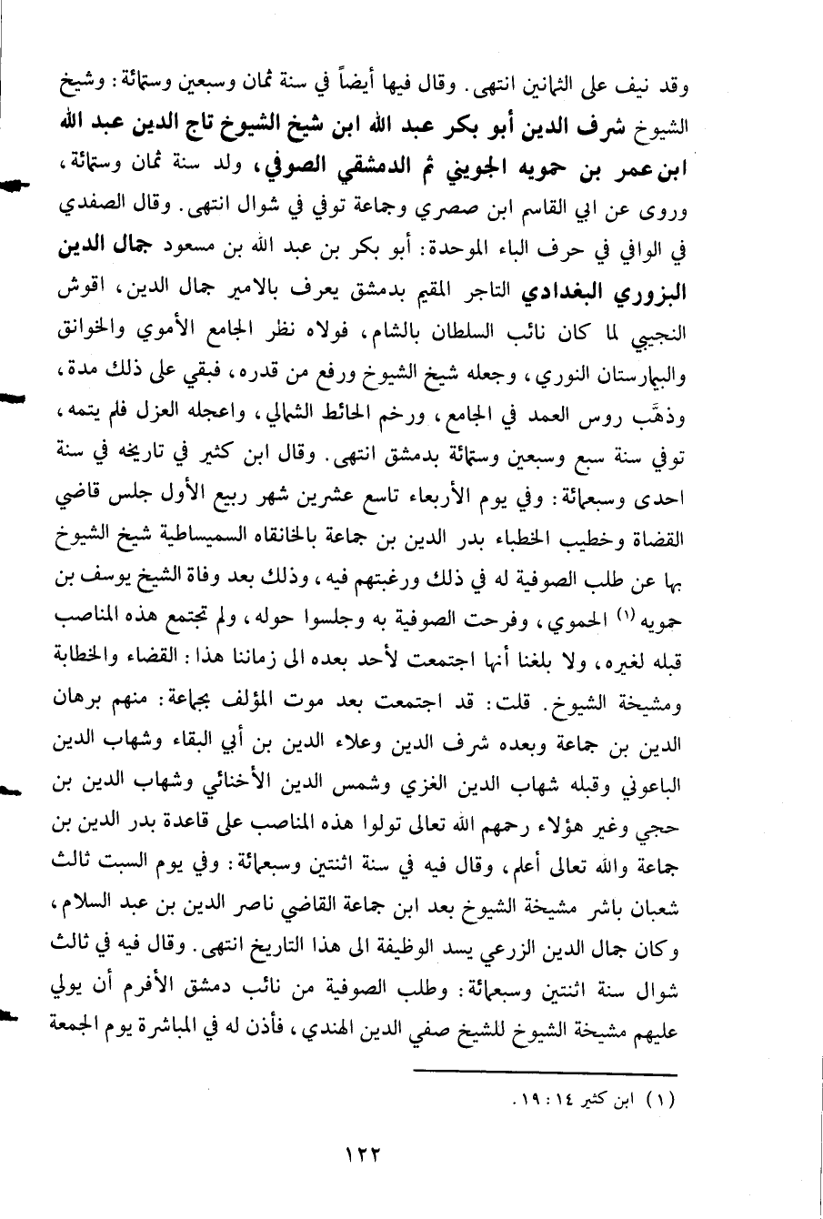 وقد نيف على الثمانين انتهى وقال فيها ايضا في سنة ثمان وسبعين وستمائة وشيخ الشيوخ شرف الدين ابو بكر عبد الله ابن شيخ الشيوخ تاج الدين عبد الله ابن عمر بن حمويه الجويني ثم الدمشقي الصوفي ولد سنة ثمان وستمائة وروى عن ابي القاسم ابن صصري وجماعة توفي في شوال انتهى وقال الصفدي في الوافي في حرف الباء الموحده ابو بكر بن عبد الله بن مسعود جمال الدين البزوري البغدادي التاجر المقيم بدمشق يعرف بالامير جمال الدين اقوش النجيبي لما كان نائب السلطان بالشام فولاه نظر الجامع الاموي والخوانق والبيمارستان النوري وجعله شيخ الشيوخ ورفع من قدره فبقي على ذلك مدة وذهب روس العمد في الجامع ورخم الحائط الشمالي واعجله العزل فلم يتمه توفي سبع وسبعين وستمائة بدمشق انتهى وقال ابن كثير في تاريخه في سنة احدى وسبعمائة وفي يوم الاربعاء تاسع عشرين شهر ربيع الاول جلس قاضي القضاة وخطيب الخطباء بدر الدين بن جماعة بالخانقاة السميساطية شيخ الشيوخ بها عن طلب الصوفية له في ذلك ورغبتهم فيه وذلك بعد وفاة الشيخ يوسف بن حموية الحموي وفرحت الصوفية به وجلسوا حول ولم تجتمع هذه المناصب قبله لغيره ولا بلغنا انها اجتمعت لاحد بعده الى زماننا هذا القضاء والخطابة ومشيخة الشيوخ قلت قد اجتمعت بعد موت المؤلف بجماعة منهم برهان الدين بن جماعة وبعده شرف الدين وعلاء الدين بن ابي البقاء وشهاب الدين الباعوني وقبله شهاب الدين الغزي وشمس الدين الاخنائى وشهاب الدين بن حجي وغير هؤلاء رحمهم الله تعالى تولوا هذه المناصب على قاعدة بدر الدين بن جماعة والله تعالى اعلم وقال فيه في سنة اثنتبن وسبعمائة وفي يوم السبت ثالث شعبان باشر مشيخة الشيوخ يعد ابن جماعة القاضي ناصر الدبن بن عبد السلام وكان جمال الدين الزرعي يسد الوظيفة الى هذا التاريخ انتهى وقال فيه في ثالث شوال سنة اثنتين وسبعمائة وطلب الصوفية من نائب دمشق الافرم ان يولي عليهم مشيخة الشيوخ للشيخ صفي الدين الهندي فاذن له في المباشرة يوم الجمعة