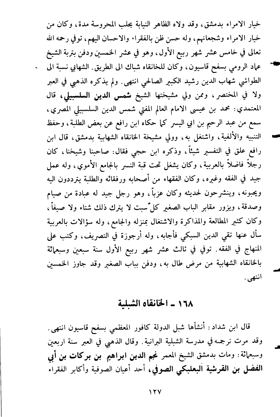 خيار الامراء بدمشق وقد ولاه الظاهر النيابة بحلب المحروسة مدة وكان من خيار الامراء وشجعانهم وله حسن ظن بالفقراء والاحسان اليهم توفي رحمه الله تعالى في خامس عشر شهر ربيع الاول وهو في عشر الخمسين ودفن بتربة الشيخ عماد الرومي بسفح قاسيون وكان للخانقاه شباك الى الطريق الشهابي نسبة الى الطواشي شهاب الدين رشيد الكبير الصالحي انتهى ولم يذكره الذهبي في العبر ولا في المختصر وممن ولي مشيختها الشيخ شمس الدين السلسبيلي قال المعتمدي محمد بن عيسى الامام العالم المفتي شمس الدين السلسبيلي المصري سمع من عبد الرحيم بن ابي اليسر كما حكاه ابن رافع عن بعض الطلبة وحفظ التنبية والالفية واشتغل به وولي مشيخة الخانقاه الشهابية بدمشق قال ابن رافع علق في التفسير شيئا وذكره ابن حجي فقال صاحبنا وشيخنا كان رجلا فاضلا بالعربية وكان يشغل تحت قبة النسر بالجامع الاموي وله عمل جيد في الفقه وغيره وكان الفقهاء من اصحابة ورفقائه والطلبة يترددون اليه ويحبونه وينشرحون لحديثه وكان عزبا وهو رجل جيد له عبادة من صيام وصدقه ويزور مقابر الباب الصغير كل سبت لا يترك ذلك شتاء ولا صيفا وكان كثير المطالعة والمذاكرة والاشتغال بمنزلة والجامع وله سؤالات بالعربية سأل عنها تقي الدين السبكي فأجابة وله ارجوزة في التصريف وكتب على المنهاج في الفقه توفي في ثالث عشر شهر ربيع الاول سنة سبعين وسبعمائة بالخانقاه الشهابية من مرض طال به ودفن بباب الصغير وقد جاوز الخمسين انتهى