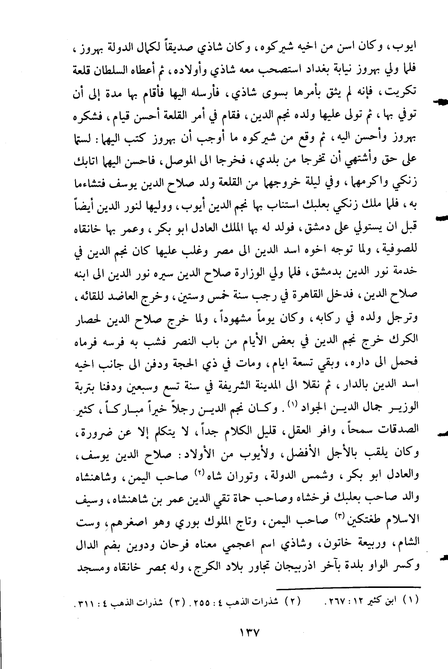 أيوب وكان أسن من أخيه شيركوه وكان شاذي صديقا لكمال الدولة بهروز فلما ولي بهروز نيابة بغداد استصحب معه شاذي وأولاده ثم اعطاه السلطان قلعة تكريب فإنه لم يثق بأمرها بسوى شاذي فأرسله إليها فأقام بها مدة إلى أن توفي بها ثم تولى عليها ولده نجم الدين فقام في أمر القلعة أحسن قيام فشكره بهروز وأحسن إليه ثم وقع من شيركوه ما أوجب أن بهروز كتب إليه ما لستما على حق واشتهى أن تخرجا من بلدي فخرجا إلى الموصل فأحسن إليه ما أتابك زنكي وأكرمهما وفي ليلة خروجهما من القلعة ولد صلاح الدين يوسف فتشاءما به فلما ملك زنكي بعلبك استناب بها نجم الدين أيوب ووليها لنور الدين أيضا قبل أن يستولي على دمشق فولد له بها الملك العادل أبو بكر وعمر بها خانقاه للصوفية ولما توجه أخوه أسد الدين إلى مصر وغلب عليها كان نجم الدين في خدمة نور الدين بدمشق فلما ولي الوزارة صلاح الدين سره نور الدين إلى ابنه صلاح الدين فدخل القاهرة في رجب سنة خمس وستين وخرج العاضد للقائه وترجل ولده في ركابة وكان يوما مشهودا ولما خرج صلاح الدين لحصار الكرك خرج نجم الدين في بعض الأيام من باب النصر فشب به فرسه فرماه فحمل إلى داره وبقي تسعة أيام ومات في ذي الحجة ودفن إلى جانب أخيه أسد الدين بالدار ثم نقلا إلى المدينة الشريفة في سنة تسع وسبعين ودفنا بتربة الوزير جمال الدين الجواد1. وكان نجم الدين رجلا خيرا مباركا كثير الصدقات سمحا وافر العقل قليل الكلام جدا لا يتكلم إلا عن ضرورة وكان يلقب بالأجل الأفضل ولأيوب من الأولاد: صلاح الدين يوسف والعادل أبو بكر وشمس الدوله وتوران شاه2 صاحب اليمن وشاهنشاه والد صاحب بعلبك فرخشاه وصاحب حماة تقي الدين عمر بن شاهنشاه وسيف الإسلام طغتكين3 صاحب اليمن وتاج الملوك بوري وهو أصغرهم وست الشام وربيعة خاتون وشاذي اسم عجمي معناه فرحان ودوين بضم الدال وكسر الواو بلدة بآخر أذربيجان تجاور بلاد الكرج وله بمصر خانقاه ومسجد