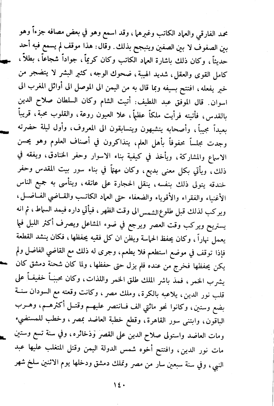 محمد ألفارقي والعماد الكاتب وغيرهما وقد أسمع وهو في بعض مصافه جزءا وهو بين الصفوف لا بين الصفين ويتبجح بذلك وقال: هذا موقف لم يسمع فيه أحد حديثا وكان ذلك بإشارة العماد الكاتب وكان كريما جوادا شجاعا بطلا كامل القوى والعقل شديد الهيبة ضحوك الوجه كثير البشر لا يتضجر من خير يفعله افتتح بسيفه وبما قال به من اليمن إلى الموصل إلى أوائل المغرب إلى أسوان قال الموفق عبد اللطيف: أتيت الشام وكان السلطان صلاح الدين بالقدس فأتيته فرأيت ملكا عظيما علا العيون روعة والقلوب محبة قريبا بعيدا مجيبا وأصحابه يتشبهون ويتسابقون إلى المعروف وأول ليلة حضرته وجدت مجلسا محفوفا بأهل العلم يتذاكرون في أصناف العلوم وهو يحسن الاسماع والمشاركة ويأخذ في كيفيه بناء الأسوار وحفر الخنادق ويفقه في ذلك ويأتي بكل معنى بديع وكان مهتما في بناء سور بيت المقدس وحفر خندقه يتولى ذلك بنفسه ينقل الحجارة على عاتقه ويتأسى به جميع الناس الاغنياء والفقراء والأقوياء والضعفاء حتى العماد الكاتب والقاضي الفاضل ويركب لذلك قبل طلوع الشمس إلى وقت الظهر فيأتي داره فيمد السماط ثم أنه يستريح ويركب وقت العصر ويرجع في ضوء المشاعل ويصرف أكثر الليل فيما يعمل نهارا وكان يحفظ الحماسة ويظن أن كل فقيه يحفظها فكان ينشد القطعة فإذا توقف في موضع استطعم فلا يطعم وجرى له ذلك مع القاضي الفاضل ولم يكن يحفظها فخرج من عنده فلم يزل حتى حفظها ولما كان شحنة دمشق كان يشرب الخمر فمذ باشر الملك طلق الخمر واللذات وكان محببا خفيفا على قلب نور الدين يلاعبه بالكرة وملك مصر وكانت وقعته مع السودان سنة بضع وستين وكانوا نحو مائتي ألف فانتصر عليهم وقتل أكثرهم وهرب الباقون وابتنى سور القاهرة وقطع حطبة العاضد بمصر وخطب للمستضيء ومات العاضد واستولى صلاح الدين على القصر وذخائره وفي سنة تسع وستين مات نور الدين وافتتح أخوه شمس الدولة اليمن وقتل المتغلب عليها عبد النبي وفي سنة سبعين سار من مصر وتملك دمشق ودخلها يوم الاثنين سلخ شهر