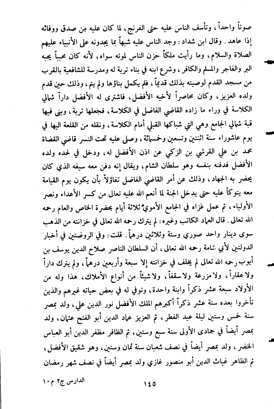 صوتا واحدا وتأسف الناس عليه حتى الفرنج لما كان عليه من صدق ووفائه إذا عاهد وقال ابن شداد: وجد الناس عليه شبها بما يجدونه على الأنبياء عليهم الصلاة والسلام وما رأيت ملكا حزن الناس لموته سواه لأنه كان محببا يحبه البر والفاجر والمسلم والكافر وشرع ابنه في بناء تربة له ومدرسة للشافعية بالقرب من مسجد القدم لوصيته بذلك قديما فلم يكمل بناؤها ولم يتم وذلك حين قدم ولده العزيز وكان محاصرا لأخيه الأفضل فاشترى له الأفضل دارا شمالي الكلاسة في وراء ما زاده القاضي الفاضل في الكلاسة فجعلها تربة وبني فيها قبة شمالي الجامع وهي التي شباكها القبلي إمام الكلاسة ونقله من القلعة إليها في يوم عاشوراء سنة اثنتين وتسعين وخمسمائة وصلي عليه تحت النسر قاضي القضاة محمد بن علي القرشي بن الزكي عن إذن الأفضل له ودخل في لحده ولده الأفضل فدفنه بنفسه وهو السلطان الشام ويقال أنه دفن معه سيفه الذي كان يحضر به الجهاد وذلك عن أمر القاضي الفاضل تفاؤلا بأن يكون يوم القيامة معه يتوكأ عليه حتى يدخل الجنة لما أنعم الله عليه تعالى من كسر الأعداء ونصر الأولياء ثم عمل عزاه في الجامع الأموي ثلاثة أيام بحضرة الخاص والعام رحمه الله تعالى. قال العماد الكاتب وغيره: لم يترك رحمه الله تعالى في خزانته من الذهب سوى دينار واحد صوري وسته وثلاثين درهما قلت: وفي الروضتين في أخبار الدولتين لأبي شامة رحمه الله تعالى أن السلطان الناصر صلاح الدين يوسف بن أيوب رحمه الله تعالى لم يخلف في خزانته إلا سبعة وأربعين درهما ولم يترك دارا ولا عقارا ولا مزرعة ولا سقفا ولاشيئا من أنواع الأملاك هذا وله من الأولاد سبعة عشر ذكرا وابنه واحدة وتوفي له في بعض حياته غيرهم والذين تأخروا بعده ستة عشر ذكرا أكبرهم الملك الأفضل نور الدين علي ولد بمصر سنة خمس وستين ليلة عيد الفطر ثم العزيز عماد الدين أبو الفتح عثمان ولد بمصر أيضا في جمادى الأولى سنة سبع وستين ثم الظافر مظفر الدين أبو العباس الخضر ولد بمصر أيضا في نصف شعبان سنة ثمان وستين وهو شقيق الأفضل ثم الظاهر غياث الدين أبو منصور غازي ولد بمصر أيضا في نصف شهر رمضان