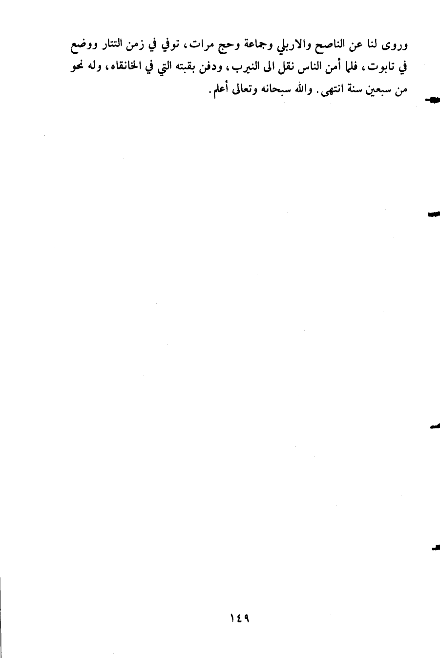 وروى لنا عن الناصح والإربلي وجماعة وحج مرات توفي في زمن التتار ووضع في تابوت فلما امن الناس نقل إلى النيرب ودفن بقبته التي في الخانقاه وله نحو من سبعين سنة انتهى. والله سبحانه وتعالى أعلم.