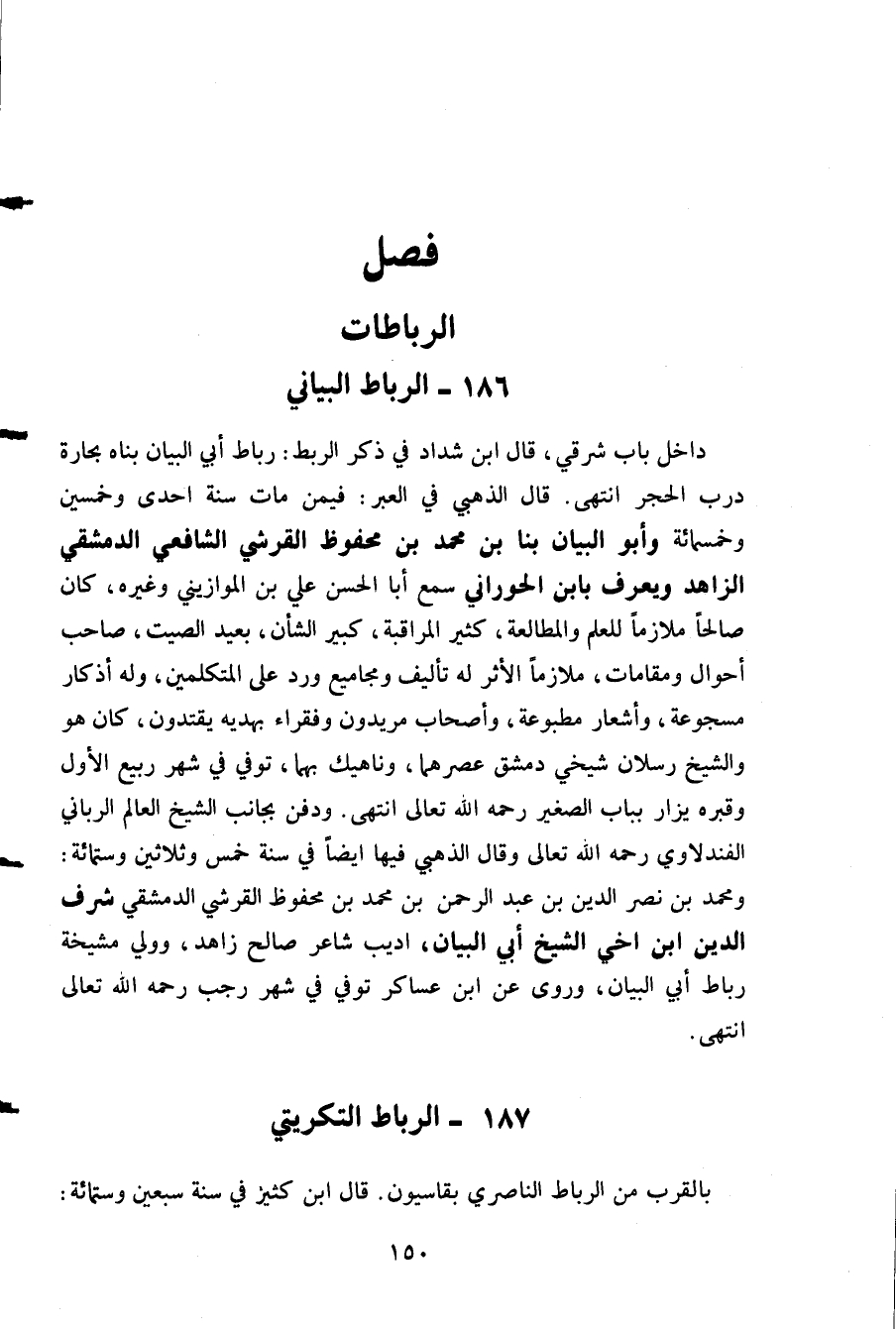 داخل باب شرقي قال ابن شداد في ذكر الربط: رباط أبي البيان بناه بحارة درب الحجر انتهى. قال الذهبي في العبر: فيمن مات سنة إحدى وخمسين وخمسمائة وأبو البيان بنا بن محمد بن محفوظ القرشي الشافعي الدمشقي الزاهد ويعرف بابن الحوراني سمع أبا الحسن علي بن الموازيني وغيره كان صالحا ملازما للعلم والمطالعة كثير المراقبة كبير الآن بعيد الصيت صاحب أحوال ومقامات ملازما الأثر له تآليف ومجاميع ورد على المتكلمين وله أذكار مسجوعة وأشعار مطبوعة وأصحاب مريدون وفقراء بهديه يقتدون كان هو والشيخ رسلان شيخي دمشق عصرهما وناهيك بهما توفي في شهر ربيع الأول وقبره يزار بباب الصغير رحمه الله تعالى انتهى. ودفن بجانب الشيخ العالم الرباني الفندلاوي رحمه الله تعالى وقال الذهبي فيها أيضا في سنة خمس وثلاثين وستمائة: ومحمد بن نصر الدين بن عبد الرحمن بن محمد بن محفوظ القرشي الدمشقي شرف الدين ابن أخي الشيخ أبي البيان أديب شاعر صالح زاهد وولي مشيخة رباط أبي البيان وروى عن ابن عساكر توفي في شهر رجب رحمه الله تعالىانتهى.