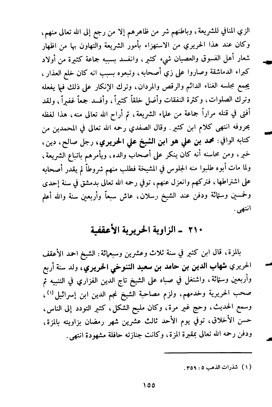 الزي المنافي للشريعة وباطنهم شر من ظاهرهم إلا من رجع إلى الله تعالى منهم وكان عند هذا الحريري من الاستهزاء بأمور الشريعة والتهاون بها من إظهار شعار أهل الفسوق والعصيان شئ كثير وانفسد بسببه جماعة كثيره من أولاد كبراء الدماشقه وصاروا على زي أصحابه وتبعوه بسبب أنه كان خلع العذار يجمع مجلسه الغناء الدائم والرقص والمردان وترك الانكار على ذلك فيما يفعله وترك الصلوات وكثرة النفقات وأظل خلقا كثيرا وأفسد جمعا غفيرا ولقد أفتى في قتله مرارا جماعة من علماء الشريعة ثم أراح الله تعالى منه هذا لفض بحروفه انتهى. كلام ابن كثير. وقال الصفدي رحمه الله تعالى في المحمدين من كتابه الوافي: محمد بن علي هو ابن الشيخ علي الحريري رجل صالح دين خير ومن محاسنه أنه كان ينكر على أصحاب والده ويأمرهم باتباع الشريعة ولم مات أبوه طلبوا منه الجلوس في المشيخة فطلب منهم شروطا لم يقدر أصحابه على اشتراطها فتركهم وانعزل عنهم توفي رحمه الله تعالى بدمشق في سنة إحدى وخمسين وستمائة ودفن عند الشيخ رسلان عاش سبعا وأربعين سنة والله أعلم.