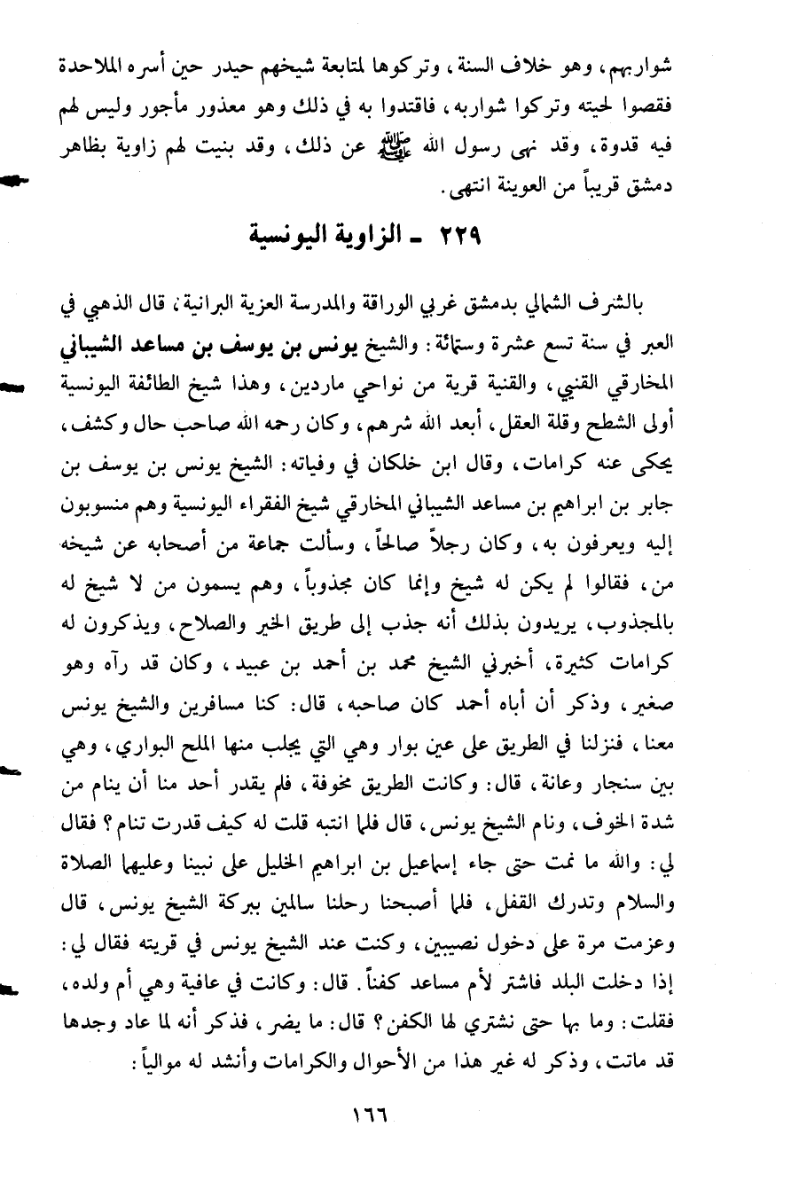 بالشرف الشمالي بدمشق غربي الوراقة والمدرسة العزية البرانية قال الذهبي في العبر في سنة تسع عشرة وستمائة: والشيخ يونس بن يوسف بن مساعد الشيباني المخارقي القنيي والقنية قرية من نواحي ماردين وهذا شيخ الطائفة اليونسية أولى الشطح وقلة العقل أبعد الله شرهم وكان رحمه الله صاحب حال وكشف يحكى عنه كرامات وقال ابن خلكان في وفياته: الشيخ يونس بن يوسف بن جابر بن إبراهيم بن مساعد الشيباني المخارقي شيخ الفقراء اليونسية وهم منسوبون إليه ويعرفون به وكان رجلا صالحا وسألت جماعة من أصحابه عن شيخه من فقالوا: لم يكن له شيخ وإنما كان مجذوبا وهم يسمون من لا شيخ له بالمجذوب يريدون بذلك أنه جذب إلى طريق الخير والصلاح ويذكرون له كرامات كثيرة أخبرني الشيخ محمد بن أحمد بن عبيد وكان قد رآه وهو صغير وذكر أن أباه أحمد كان صاحبه قال: كنا مسافرين والشيخ يونس معنا فنزلنا في الطريق على عين بوار وهي التي يجلب منها الملح البواري وهي بين سنجار وعانة قال: وكانت الطريق مخوفة فلم يقدر أحد منا أن ينام من شدة الخوف ونام الشيخ يونس قال: فلما انتبه قلت له: كيف قدرت تنام فقال لي: والله ما نمت حتى جاء إسماعيل بن إبراهيم الخليل على نبينا وعليهما الصلاة والسلام وتدرك القفل فلما أصبحنا رحلنا سالمين ببركة الشيخ يونس قال: وعزمت مرة على دخول نصيبين وكنت عند الشيخ يونس في قريته فقال لي: إذا دخلت البلد فاشتر لام مساعد كفنا قال: وكانت في عافية وهي ام ولده فقلت: وما بها حتى نشتري لها الكفن قال: ما يضر فذكر أنه لما عاد وجدها قد ماتت وذكر له غير هذا من الأحوال والكرامات وأنشد له مواليا: