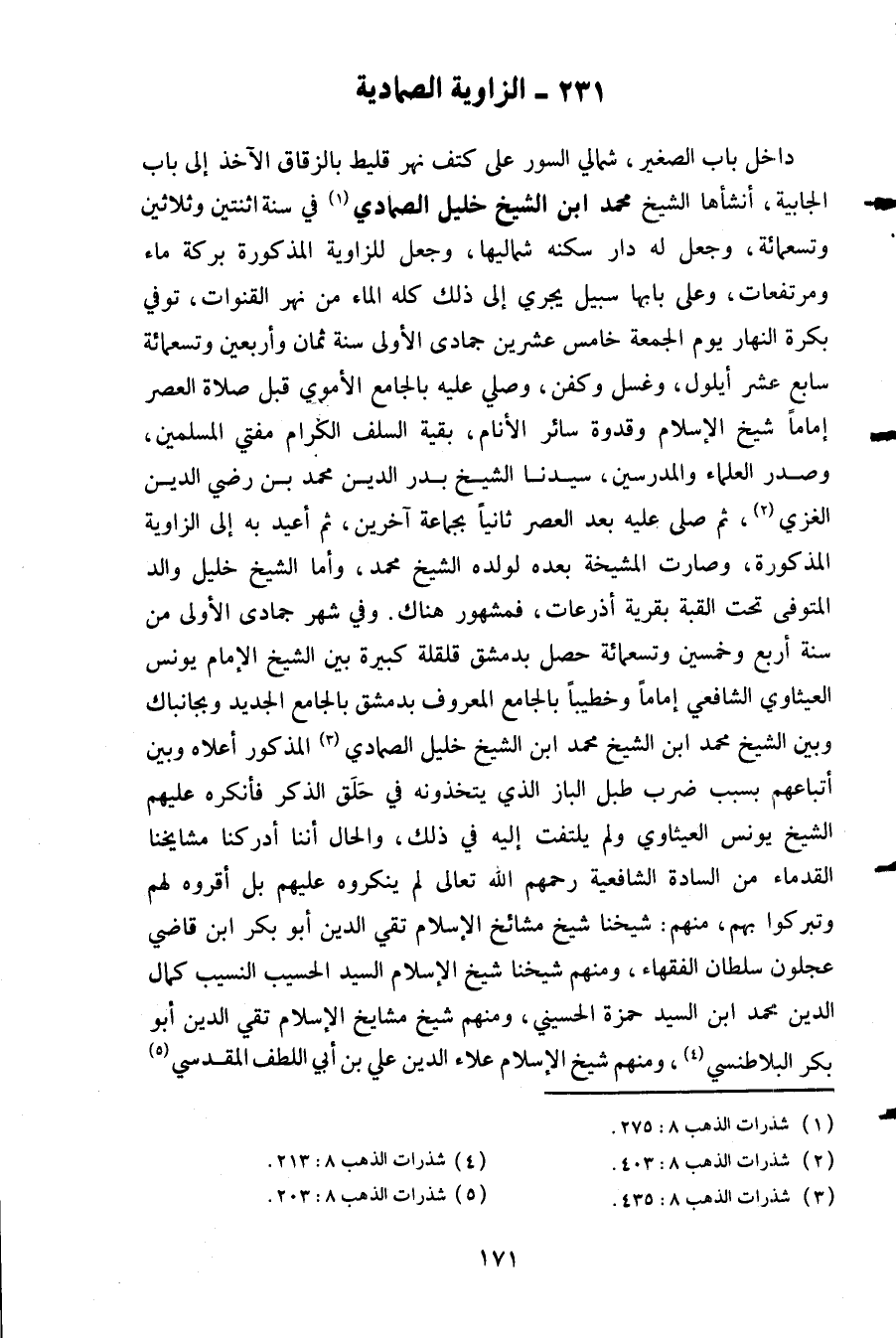 داخل باب الصغير شمالي السور على كتف نهر قليط بالزقاق الأخذ إلى باب الجابية أنشأها الشيخ محمد ابن الشيخ خليل الصمادي1 في سنة اثنتين وثلاثين وتسعمائة وجعل له دار سكنه شم إليها وجعل للزاوية المذكورة بركة ماء ومرتفعات وعلى بابها سبيل يجري إلى ذلك كله الماء من نهر القنوات توفي بكرة النهار يوم الجمعة خامس عشرين جمادى الأولى سنة ثمان وأربعين وتسعمائة سابع عشر أيلول وغسل وكفن وصلي عليه بالجامع الأموي قبل صلاة العصر إماما شيخ الإسلام وقدوة سائر الأنام بقية السلف الكرام مفتي المسلمين وصدر العلماء والمدرسين سيدنا الشيخ بدر الدين محمد بن رضي الدين الغزي2 ثم صلى عليه بعد العصر ثانيا بجماعة اخرين ثم أعيد به إلى الزاوية المذكورة وصارت المشيخة بعده لولده الشيخ محمد وأما الشيخ خليل والد المتوفي تحت القبة بقرية اذرعات فمشهور هناك. وفي شهر جمادى الأولى من سنة أربع وخمسين وتسعمائة حصل بدمشق قلقلة كبيرة بين الشيخ الإمام يونس العيثاوي الشافعي إماما وخطيبا بالجامع المعروف بدمشق بالجامع الجديد وبجانباك وبين الشيخ محمد ابن الشيخ محمد ابن الشيخ خليل الصمادي3 المذكور اعلاه وبين اتباعهم بسبب ضرب طبل الباز الذي يتخذونه في حلق الذكر فأنكره عليهم الشيخ يونس العيثاوي ولم يلتفت إليه ذلك والحال أننا أدركنا مشايخنا القدماء من السادة الشافعية رحمهم الله تعالى لم ينكروه عليهم بل أقروه لهم وتبركوا بهم منهم: شيخنا شيخ مشايخ الإسلام تقي الدين أبو بكر ابن قاضي عجلون سلطان الفقهاء ومنهم شيخنا شيخ الإسلام السيد الحسيب النسيب كمال الدين محمد ابن السيد حمزة الحسيني ومنهم شيخ مشايخ الإسلام تقي الدين أبو بكر البلاطنسي4 ومنهم شيخ الإسلام علاء الدين علي بن أبي اللطيف المقدسي5