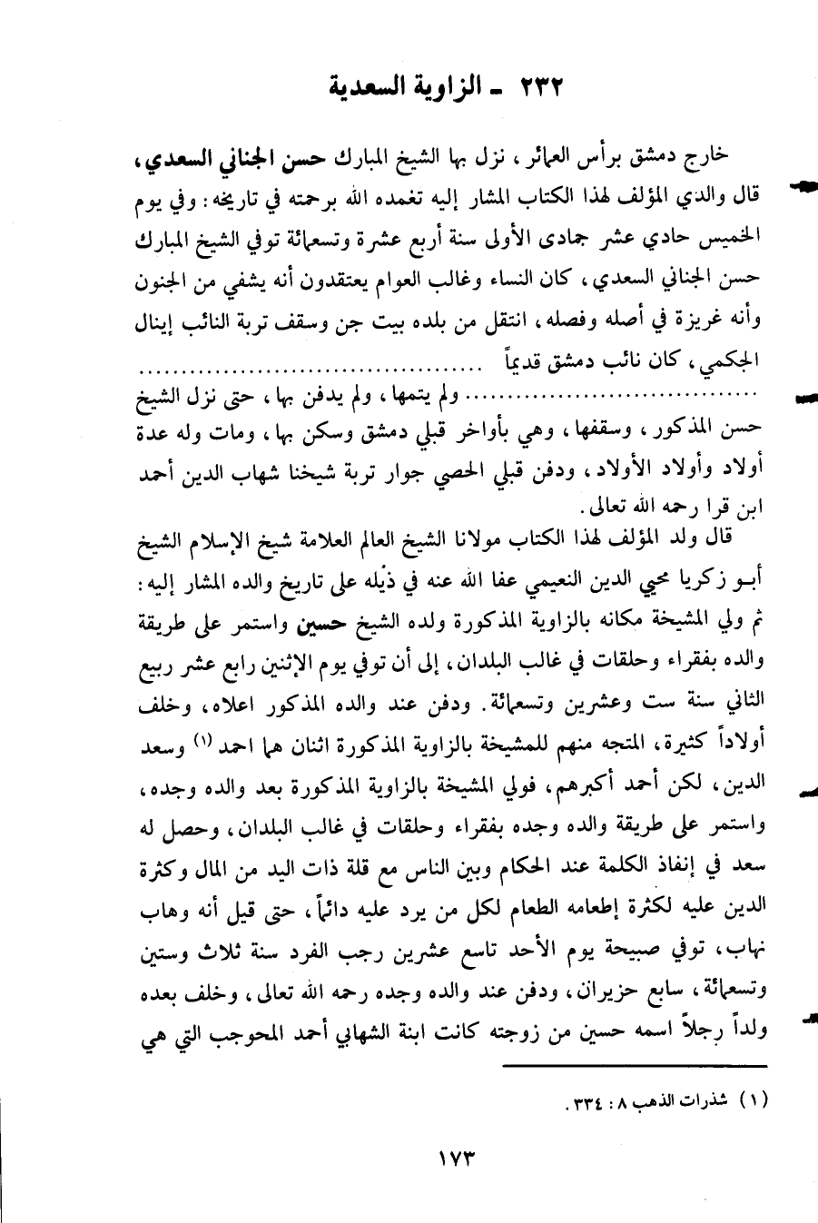 خارج دمشق برأس العمائر نزل بها الشيخ المبارك حسن الجناني السعدي قال والدي المؤلف لهذا الكتاب المشار إليه تغمده الله برحمته في تاريخه: وفي يوم الخميس حادي عشر جمادى الأولى سنة أربع عشرة وتسعمائة توفي الشيخ المبارك حسن الجناني السعدي كان النساء وغالب العوام يعتقدون أنه يشفي من الجنون وأنه غريزة في أصله وفصله انتقل من بلدة بيت جن وسقف تربة النائب أي نال الجمكي كان نائب دمشق قديما.......... ...............................................ولم يتمها ولم يدفن بها حتى نزل الشيخ حسن المذكور وسقفها وهي بأواخر قبلي دمشق وسكن بها ومات وله عدة أولاد وأولاد الأولاد ودفن قبلي الحصي جوار تربة شيخنا شهاب الدين أحمد ابن قرار رحمه الله تعالى. قال ولد المؤلف لهذا الكتاب مولانا الشيخ العالم العلامة شيخ الإسلام الشيخ أبو زكريا محيي الدين النعيمي عفا الله عنه في ذيله على تاريخ والده المشار إليه: ثم ولي المشيخة مكانه بالزاوية المذكورة ولده الشيخ حسين واستمر على طريقة والده بفقراء وحلقات في غالب البلدان إلى أن توفي يوم الاثنين رابع عشر ربيع الثاني سنة ست وعشرين وتسعمائة. ودفن عند والده المذكور أعلاه وخلف أولادا كثيرة المتجه منهم للمشيخة بالزاوية المذكورة اثنان هما أحمد1 وسعد الدين لكن أحمد أكبرهم فولي المشيخة بالزاوية المذكورة بعد والده وجده واستمر على طريقة والده وجده بفقراء وحلقات في غالب البلدان وحصل سعد في إنفاذ الكلمة عند الحكام وبين الناس مع قلة ذات اليد من المال وكثرة الدين عليه لكثرة إطعامه الطعام لكل من يرد عليه دائما حتى قيل أنه وهاب نهاب توفي صبيحة يوم الأحد تاسع عشرين رجب الفرد سنة ثلاث وستين وتسعمائة سابع حزيران ودفن عند والده وجده رحمه الله تعالى وخلف بعده ولدا رجلا اسمه حسين من زوجته كانت ابنة الشهابي أحمد المحجوب التي هي