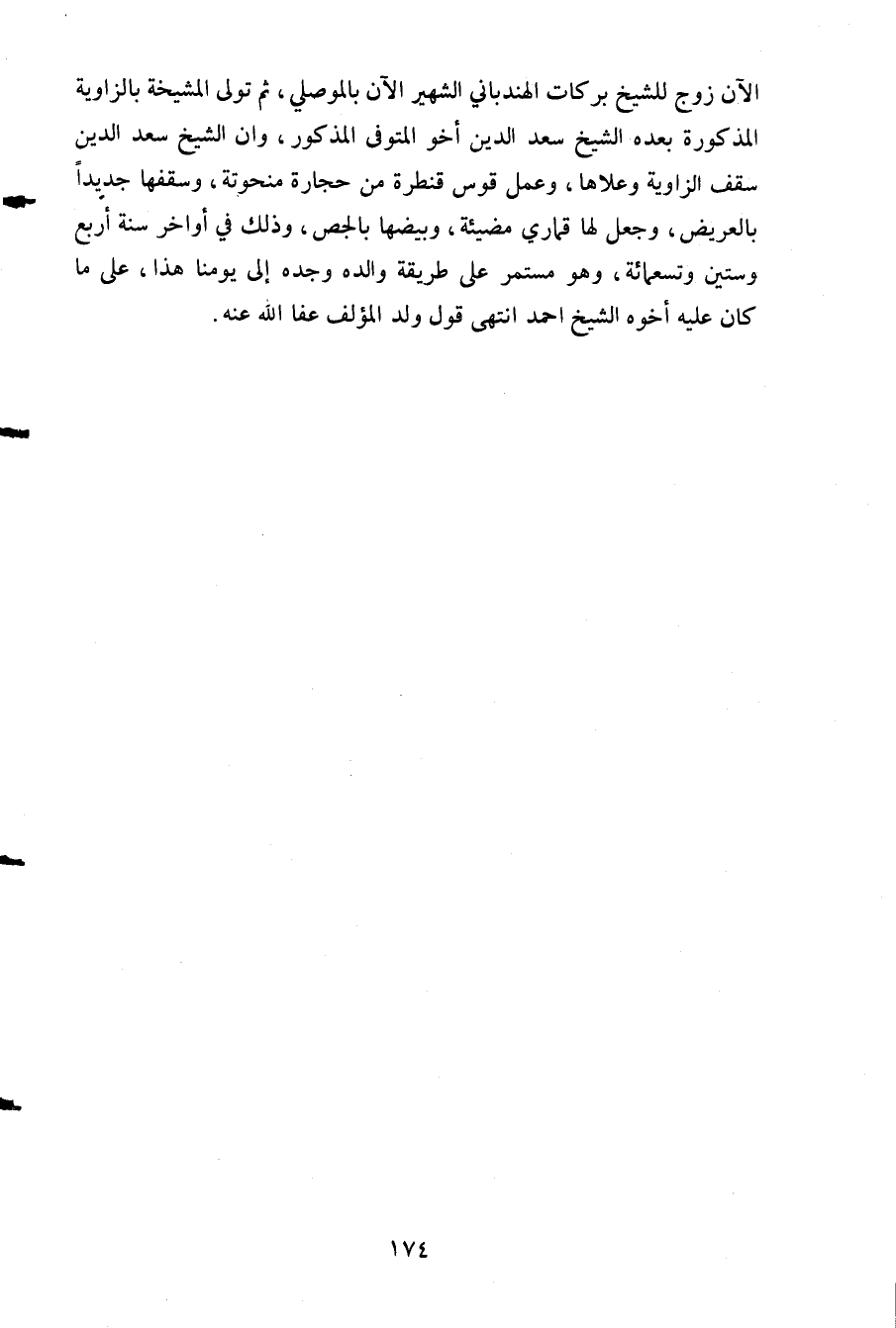 الآن زوج للشيخ بركات الهندباني الشهير الآن بالموصلي ثم تولى المشيخة بالزاوية المذكورة بعده الشيخ سعد الدين أخو المتوفى المذكور وأن الشيخ سعد الدين سقف الزاوية وعلاها وعمل قوس قنطرة من حجارة منحوتة وسقفها جديدا بالعريض وجعل لها قماري مضيئة وبيضها بالجص وذلك في أواخر سنة أربع وستين وتسعمائة وهو مستمر على طريقة والده وجده إلى يومنا هذا على ما كان عليه أخوه الشيخ أحمد انتهى. قول ولد المؤلف عفا الله عنه.