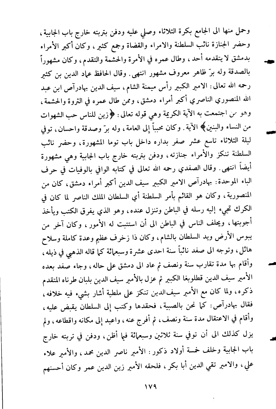 وحمل منها إلى الجامع بكرة الثلاثاء وصلي عليه ودفن بتربته خارج باب الجابية وحضر الجنازة نائب السلطنة والأمراء والقضاة وجمع كثير وكان أكبر الأمراء بدمشق لا يتقدمه أحد وطال عمره في الأمر ة والحشمة والتقدم وكان مشهورا بالصدقة وله بر ظاهر معروف مشهور انتهى. وقال الحافظ عماد الدين بن كثير رحمه الله تعالى: الأمير الكبير رأس ميمنة الشام سيف الدين بهادرآص ابن عبد الله المنصوري الناصري أكبر أمراء دمشق وممن طال عمره في الروة والحشمة وهو من اجتمعت به الآية الكريمة وهي قوله تعالى: {زُيِّنَ لِلنَّاسِ حُبُّ الشَّهَوَاتِ مِنَ النِّسَاءِ وَالْبَنِينَ} الآية. وكان محببا إلى العامة وله بر وصدقة وإحسان توفي ليلة الثلاثاء تاسع عشر صفر بداره داخل باب توما المشهورة وحضر نائب السلطنة تنكز والأمراء جنازته ودفن بتربته خارج باب الجابية وهي مشهورة أيضا انتهى. وقال الصفدي رحمه الله تعالى في كتابه الوافي بالوفيات في حرف الباء الموحدة: بهادراص الأمير الكبير سيف الدين أكبر أمراء دمشق كان من المنصورية وكان هو القائم بأمر السلطنة أي السلطان الملك الناصر لما كان في الكرك تجئ إليه رسله في الباطن وتنزل عنده وهو الذي يفرق الكتب ويأخذ أجوبتها ويحلف الناس في الباطن إلى أن استتبت له الأمور وكان آخر من يبوس الأرض ويد السلطان بالشام وكان ذا زخرف عظيم وعدة كاملة وسلاح هائل وتوجه إلى صفد نائبا سنة إحدى عشرة وسبعمائة كما قاله الذهبي في ذيله وأقام بها مدة تقارب سنة ونصف ثم عاد إلى دمشق على حاله وجاء صفد بعده الأمير سيف الدين قطلوبغا الكبير ثم عزل بالأمير سيف الدين بلبان طرناه المتقدم ذكره ولما كان مع الأمير سيف الدين تنكز على ملطية أشار بشيء فيه خلافة فقال: بهادارص كما نحن بالصبية فحقدها وكتب عليها إلى السلطان يقبض عليه وأقام في الاعتقال مدة سنة ونصف ثم أفرج عنه وأعيد إلى مك أنه واقطاعه ولم يزل كذلك إلى أن توفي سنة ثلاثين وسبعمائة فيما أظن زدفن في تربته خارج باب الجابية وخلف خمسة أولاد ذكور: الأمير ناصر الدين محمد والأمير علاء علي والأمير تقي الدين أبا بكر فلحقه الأمير زين الدين عمر وكان أحسنهم