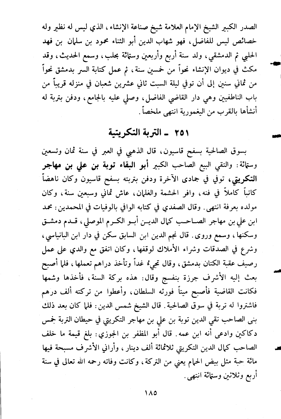 يسوق الصالحية يسفح قاسيون قال الذهبي في العبر في سنة ثمان وتسعين وستمائة: والتقي البيع الصاحب الكبير أبو البقاء توبة بن علي بن مهاجر التكريتي توفي في جمادى الآخرة ودفن بتربته بسفح قاسيون وكان ناهضا كاتبا كاملا في فنه وافر الحشمة والغلمان عاش ثماني وسبعين سنة وكان مولده بعرفة انتهى. وقال الصفدي في كتابه الوافي بالوفيات في المحمدين: محمد ابن علي بن مهاجر الصاحب كمال الدين أبو الكرم الموصلي قدم دمشق وسكنها وسمع وروى. قال نجم الدين ابن السابق سكن في دار ابن البانياسي وشرع في الصدقات وشراء الأملاك لوقفها وكان اتفق مع والدي على عمل رصيف عقبة الكتان يدمشق وقال تجيء غدا وتأخذ دراهم تعملها فلما أصبح بعث إليه الأشراف جرزة بنفسج وقال: هذه بركة السنة فأخذها وشمها فكانت القاضية فأصبح ميتا فورثه السلطان وأعطوا من تركته ألف درهم فاشتروا له تربة في سوق الصالحية. قال الشيخ شمس الدين: فلما كان بعد ذلك بني الصاحب تقي الدين توبة بن علي بن مهاجر التكريتي في حيطان التربة خمس دكاكين وادعى أنه ابن عمه. قال أبو المظفر بن الجوزي: بلغ قيمة ما خلف الصاحب كمال الدين التكريتي ثلاثمائة ألف دينار وأراني الأشرف مسبحة فيها مائة حبة مثل بيض الحمام يعني من التركة وكانت وفاته رحمه الله تعالى في سنة أربع وثلاثين وستمائة انتهى.