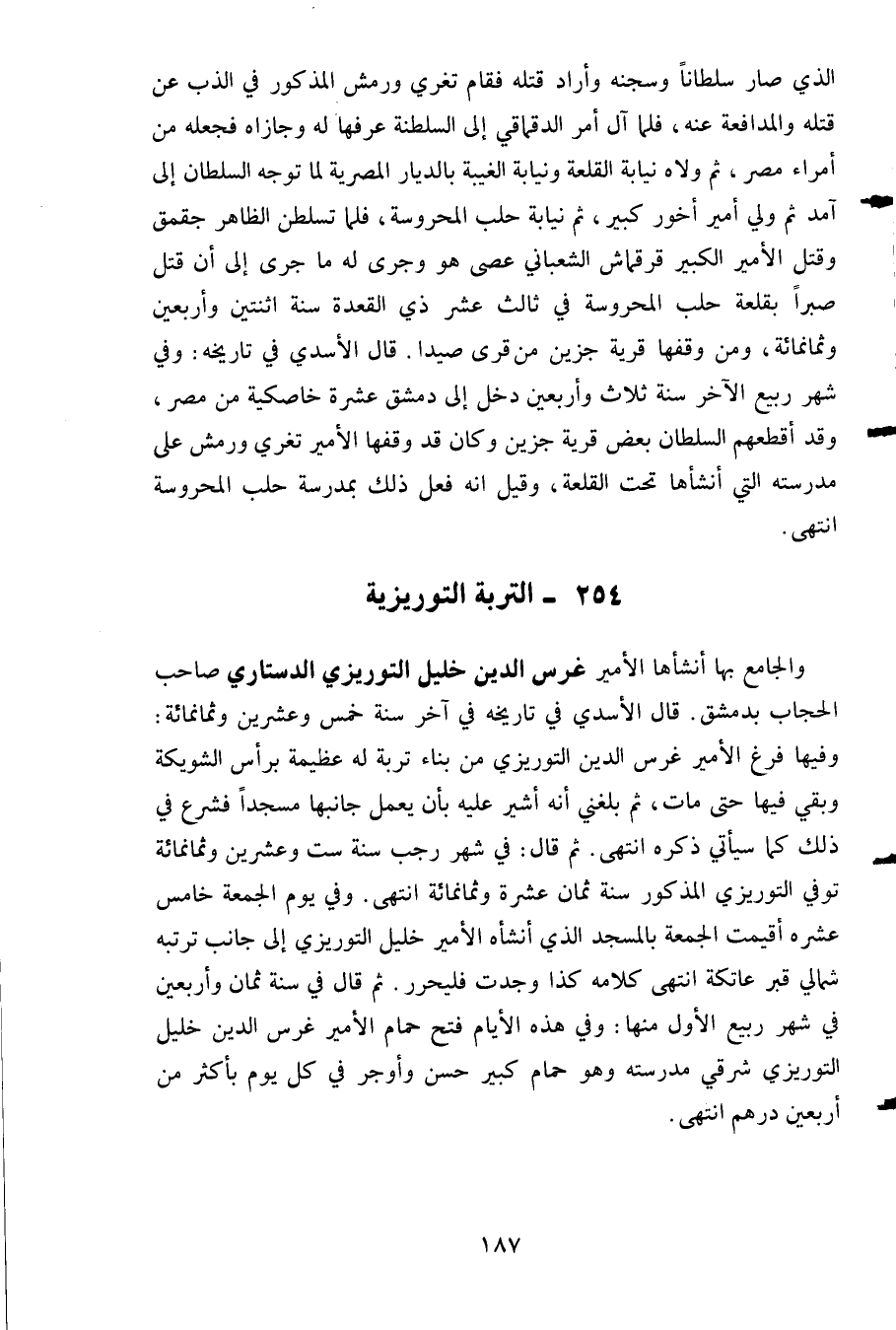 الذي صار سلطانا وسجنه وأراد قتله فقام تغري ورمش المذكور في الذب عن قتله والمدافعة عنه فلما آل أمر الدقماقي إلى السلطنة عرفها له وجازاه فجعله من أمراء مصر ثم ولاه نيابة القلعة ونيابة الغيبة بالديار المصرية لما توجه السلطان إلى أمد ثم ولي أمير أخور كبير ثم نيابة حلب المحروسة فلما تسلطن الظاهر جقمق وقتل الأمير الكبير قرقماش الشعباني عصى هو وجرى له ما جرى إلى أن قتل صبرا بقلعة حلب المحروسة في ثالث عشر ذى القعدة سنة اثنتين وأربعين وثمانمائة ومن وقفها قرية جزين من قرى صيدا قال الأسدي في تاريخه: وفي شهر ربيع الآخر سنة ثلاث وأربعين دخل إلى دمشق عشرة خاصكية من مصر وقد أقطعهم السلطان بعض قرية جزين وكان قد وقفها الأمير ثغري ورمش على مدرسته التي أنشأها تحت القلعة وقيا أنه فعل ذلك بمدرسة حلب المحروسة انتهى.