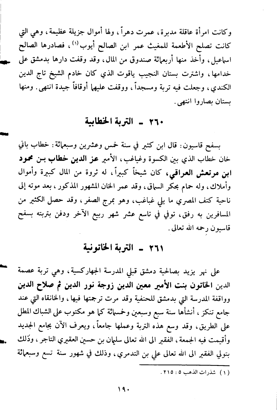 بسفح قاسيون: قال ابن كثير في سنة خمس وعشرين وسبعمائة: خطاب باني خان خطاب الذي بين الكسوة وغياغب الأمير عز الدين خطاب بن محمود ابن مرتعش العراقي كان شيخا كبيرا له ثروة من المال كبيره وأموال وأملاك وله حمام بحكر السماق وقد عمر الخان المشهور المذكور بعد موته إلى ناحية كتف المصري ما يلي غباغب وهو بمرج الصفر وقد حصل الكثير من المسافرين به رفق توفي في تاسع عشر ربيع الآخر ودفن بتربته بسفح قاسيون رحمه الله تعالى.