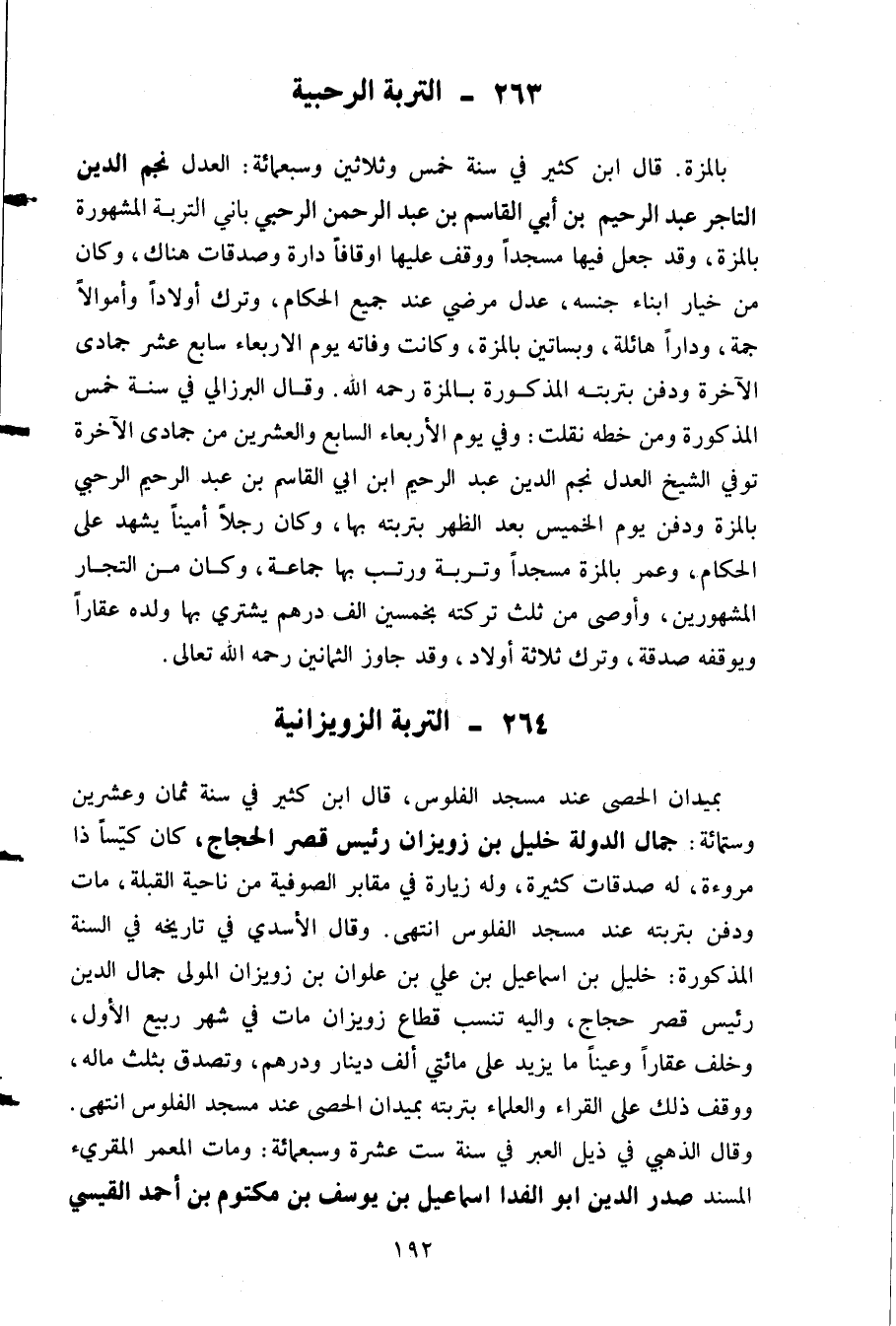 بالمزة. قال ابن كثير في سنة خمس وثلاثين وسبعمائة: العدل نجم الدين التاجر عبد الرحيم بن أبي القاسم بن عبد الرحمن الرحبي باني التربة المشهورة بالمزة وقد جعل فيها مسجدا ووقف عليها أوقافا دارة وصدقات هناك وكان من خيار أبناء جنسه عدل مرضي عند جميع الحكام وترك أولادا وأموالا جمة ودارا هائلة وبساتين بالمزة وكانت وفاته يوم الأربعاء سابع عشر جمادى الآخرة ودفن بتربة المذكورة بالمزة رحمه الله. وقال البرزالي في سنة خمس المذكورة ومن خطه نقلت: وفي يوم الأربعاء السابع والعشرين من جمادى الآخرة توفي الشيخ العدل نجم الدين عبد الرحيم ابن أبي القاسم بن عبد الرحيم الرحبي بالمزة ودفن يوم الخميس بعد الظهر بتربته بها وكان رجلا أمينا يشهد على الحكام وعمر بالمزة مسجدا وتربة ورتب بها جماعة وكان من التجار المشهورين وأوصى من ثلث تركته بخمسين ألف درهم يشتري بها ولده عقارا ويوقفه صدقة وترك ثلاثة أولاد وقد جاوز الثمانين رحمه الله تعالى.