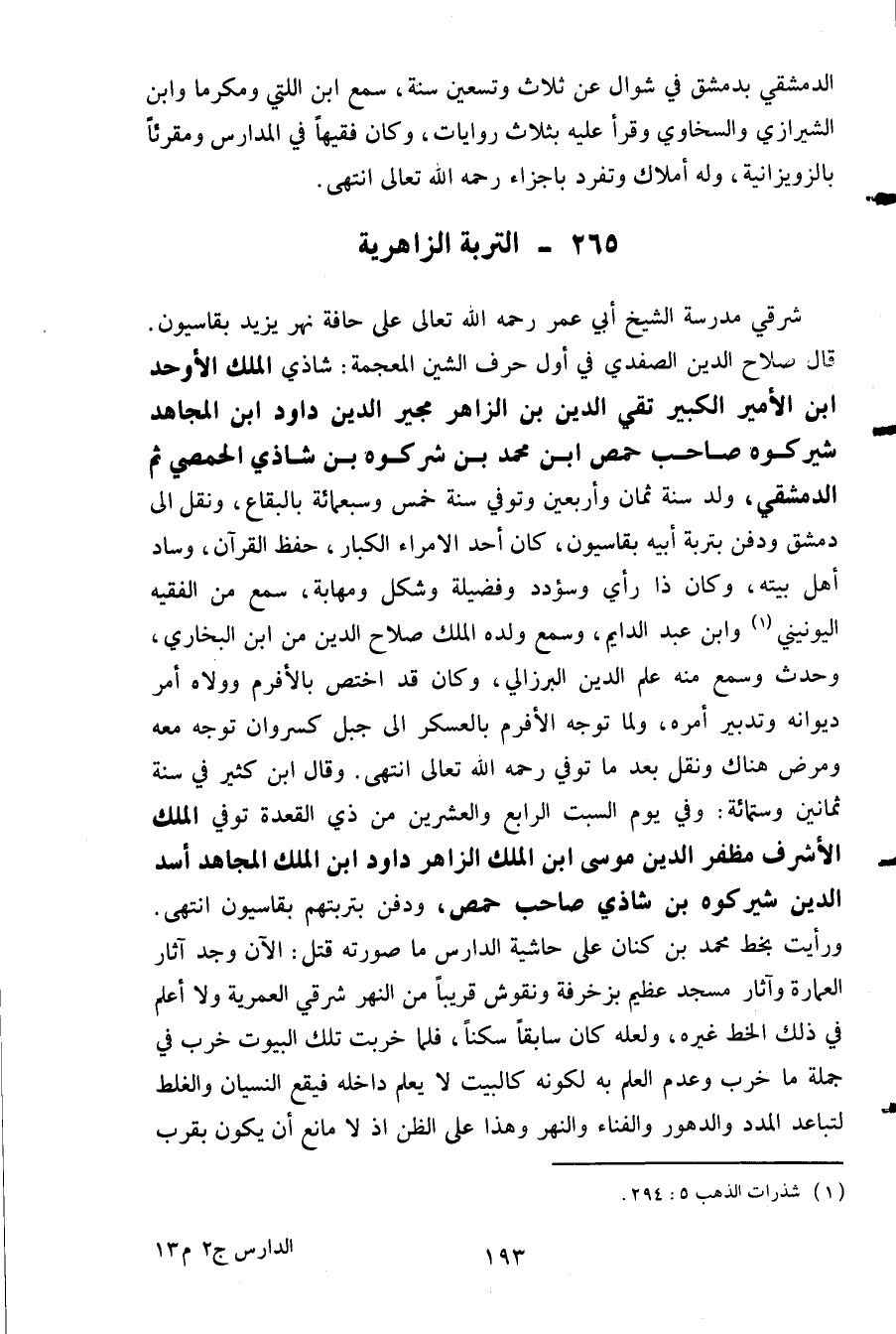 شرقي مدرسة الشيخ أبي عمر رحمه الله تعالى على حافة نهر يزيد بقاسيون قال صلاح الدين الصفدي في أول حرف الشين المعجمة: شاذي الملك الاوحد ابن الأمير الكبير تقي الدين بن الزاهر مجير الدين داود ابن المجاهد شيركوه صاحب حمص ابن محمد بن شركوه بن شاذي الحمصي ثم الدمشقي ولد سنة ثمان وأربعين وتوفي سنة خمس وسبعمائة بالبقاع ونقل إلى دمشق ودفن بتربة أبيه بقاسيون كان أحد الأمراء الكبار حفظ القرآن وساد أهل بيته وكان ذا رأي وسؤدد وفضيله وشكل ومهابة سمع من الفقيه اليونيني1 وابن عبد الدايم وسمع ولده الملك صلاح الدين من ابن البخاري وحدث وسمع منه علم الدين البرزالي وكان قد أختص بالأفرم وولاه أمر ديوانه وتدبير أمره ولما توجه الأفرم بالعسكر إلى جبل كسروان توجه معه ومرض هناك ونقل بعد ما توفي رحمه الله تعالى انتهى. وقال ابن كثير في سنة ثمانين وستمائة: وفي يوم السبت الرابع والعشرين من ذي القعدة توفي الملك الأشرف مظفر الدين موسى ابن الملك الزاهر داود ابن الملك المجاهد أسد الدين شيركوه بن شاذي صاحب حمص ودفن بتربتهم بقاسيون انتهى. ورأيت بخط محمد بن كنان على حاشية الدارس ما صورته قتل: الآن وجد آثار العمارة وآثار مسجد عظيم بزخرفة ونقوش قريبا من النهر شرقي العمرية ولا أعلم في ذلك الخط ولعله كان سابقا سكنا فلما خربت تلك البيوت خرب في جملة ما خرب وعدم العلم به لكونه كالبيت لا يعلم داخله فيقع النسيان والغلط لتباعد المدد والدهور والفناء والنهر وهذا على الظن اذ لا مانع أن يكون بقرب