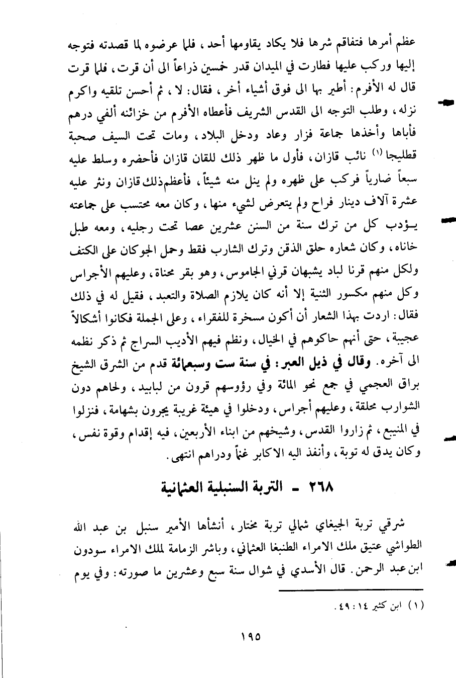 عظم أمرها فتفاقم شرها فلا يكاد يقاومها أحد فلما عرضوه لما قصدته فتوجه إليها وركب عليها فطارت في الميدان قدر خمسين ذراعا إلى أن قرت فلما قرت قال له الأفرم: أطير بها إلى فوق أشياء آخر فقال: لا ثم أحسن تلقية وأكرم نزله وطلب التوجه إلى القدس الشريف فاعطاه الأفرم من خزائنه ألفي درهم فاها وأخذها جماعة فزار وعاد ودخل البلاد ومات تحت السيف صحبة قطليجا1 نائب قازان فأول ما ظهر ذلك للقان قازان فاحضر وسلط عليه سبعا ضاريا فركب على ظهره ولم ينل منه شيئا فأعظم ذلك قازان ونثر عليه عشرة الآف دينار فراح ولم يتعرض لشئ منها وكان معه محتسب على جماعته يؤدب كل من ترك سنة من السنين عشرين عصا تحت رجليه ومعه طبل خاناه وكان شعاره حلق الذقن وترك الشارب فقط وحمل الجوكان على الكتف ولكل منهم قرنا لباد يشبهان قرني الجاموس وهو بقر محناة وعليهم الأجراس وكل منهم مكسور الثنية إلا أنه كان يلازم الصلاة والتعبد فقيل له في ذلك فقال: أردت بهذا الشعار أن أكون مسخرة للفقراء وعلى الجملة فكانوا أشكالا عجيبة حتى أنهم حاكوهم في الخيال ونظم فيهم الأديب السراج ثم ذكر نظمه إلى آخره. وقال في ذيل العبر في سنة ست وسبعمائة: قدم من الشرق الشيخ براق العجمي في جمع نحو المائة وفي رؤوسهم قرون من لبابيد ولحاهم دون الشوارب محلقة وعليهم أجراس ودخلوا في هيئة غريبة يجرون بشهامة فنزلوا في المنيع ثم زاروا القدس وشيخهم من أبناء الأربعين فيه إقدام وقوة نفس وكان يدق له توبة وأنفذ إليه الأكابر غنما ودراهم انتهى.