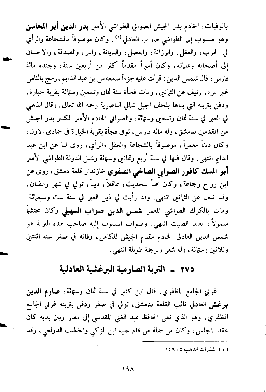 بالوفيات: الخادم بدر الجيش الصوابي الطواشي الأمير بدر الدين أبو المحاسن وهو منسوب إلى الطواشي صواب العادلي1 وكان موصوفا بالشجاعة والرأي في الحرب والعقل والرزانة والفضل والديانة والبر والصدقة والإحسان إلى أصحابة وغلمانه وكان أميرا مقدما أكثر من أربعين سنة وجنده مائة فارس قال شمس الدين: قرأت عليه جزءا سمعه من ابن عبد الدايم وحج بالناس غير مرة ونيف عن الثمانين ومات فجأة سنة ثمان وتسعين وستمائة بقرية خيارة ودفن بتربته التي بناها بلحف الجبل شمالي الناصرية رحمه الله تعالى وقال الذهبي في العبر في سنة ثمان وتسعين وستمائة: والصوابي الخادم الأمير الكبير بدر الجيش من المقدمين بدمشق وله مائة فارس توفي فجأة بقرية الخيارة في جمادى الأول وكان دينا معمرا موصوفا بالشجاعة والعقل والرأي روى لنا عن ابن عبد الدايم انتهى. وقال فيها في سنة أربع وثمانين وستمائة وشبل الدولة الطواشي الأمير أبو المسك كافور الصوابي الصالحي الصفوي خازندار قلعة دمشق روى عن ابن رواح وجماعة وكان محبا للحديث عاقلا دينا توفي في شهر رمضان وقد نيف عن الثمانين انتهى. وقد رأيت في ذيل العبر في سنة ست وسبعمائة ومات بالكرك الطواشي المعمر شمس الدين صواب السهلي وكان محتشما متمولا بعيد الصيت انتهى. وصواب المنسوب إليه صاحب هذه التربة هو شمس الدين العادلي الخادم مقدم الجيش للكامل وفاته في صفر سنة اثنتين وثلاثين وستمائة وله شعر وترجمة طويلة انتهى.
