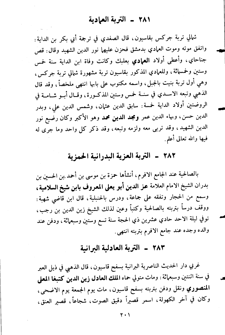 شمالي تربة جركس بقاسيون قال الصفدي في ترجمة أبي بكر بن الداية: واتفق موته وموت العمادي بدمشق فخزن عليهما نور الدين الشهيد وقال: قص جناح أي وأعطى أولاد العمادي بعلبك وكانت وفاة ابن الدايه سنة خمس وستين وخمسمائه وللعمادي المذكور بقاسيون تربه مشهوره شمالي تربة جركس وهي أول تربة بنيت بالجبل واسمه مكتوب على بابها انتهى. ملخصا وقد قال الذهبي وتبعه الأسدي في سنة خمس وستين المذكورة وقال أبو شامة في الروضتين أولاد الدايه خمسة: سابق الدين عثمان وشمس الدين على وبدر الدين حسن وبهاء الدين عمر ومجد الدين محمد وهو الأكبر وكان رضيع نور الدين الشهيد وقد تربى معه ولزمه وتبعه وقد ذكر كل واحد وما جرى له فيها والله تعالى أعلم.