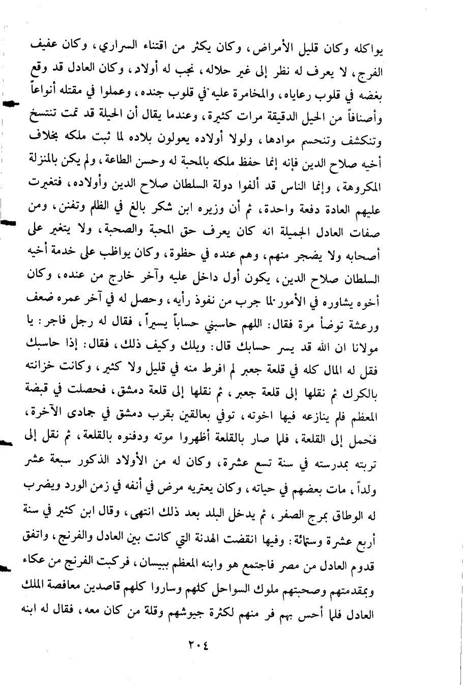 يواكله وكان قليل الأمراض وكان يكثر من اقتناء السراري وكان عفيف الفرج لا يعرف له نظر إلى غير حلاله نجب له أولاد وكان العادل قد وقع بغضه في قلوب رعاياه والمخامرة عليه في قلوب جنده وعملوا في مقتله أنواعا وأصنافا من الحيل الدقبقة مرات كثيرة وعندما يقال أن الحيلة قد تمت تنتسخ وتنكشف وتنحسم موادها ولولا أولاده يعولون بلاده لما ثبت ملكه بخلاف أخيه صلاح الدين فإنه إنما حفظ ملكه بالمحبة له وحسن الطاعة ولم يكن بالمنزلة المكروهة وإنما الناس قد ألفوا دولة السلطان صلاح الدين وأولاده فتغيرت عليهم العادة دفعة واحدة ثم إن وزيره ابن شكر بالغ في الظلم وتفنن ومن صفات العادل الجميلة أنه كان يعرف حق المحبة والصحبة ولا بتغير على أصحابة ولا يضجر منهم وهم عنده في حظوة وكان يواظب على خدمة أخيه السلطان صلاح الدين يكون أول داخل عليه وآخر خارج من عنده وكان أخوه يشاوره في الأمور لما جرب من نفوذ رأيه وحصل له في آخر عمره ضعف ورعشة توضأ مرة فقال: اللهم حاسبني حسابا يسيرا فقال له رجل: فاجر يا مولانا إن الله قد يسر حسابك قال: ويلك وكيف ذلك فقال: إذا حاسبك فقل له المال كله في قلعة جعبر لم أفرط منه في قليل ولا كثير وكانت خزانته بالكرك ثم نقلها إلى قلعة حعبر ثم نقلها إلى قلعة دمشق فحصلت في قبضة المعظم فلم ينازعه فيها إخوته توفي بعالقين بقرب دمشق في جمادى الآخرة فحمل إلى القلعة فلما صار بالقلعة أظهروا موته ودفنوه بالقلعة ثم نقل إلى تربته بمدرستة في سنة تسع عشرة وكان له من الأولاد الذكور سبعة عشر ولدا مات بعضهم في حياته وكان يعتريه مرض في أنفه في زمن الورد ويضرب له الوطاق بمرج الصفر ثم يدخل البلد بعد ذلك انتهى. وقال ابن كثير في سنة أربع عشرة وستمائة: وفيها انقضت الهدنة التي كانت بين العادل والفرنج واتفق قدوم العادل من مصر فاجتمع هو وابنه المعظم ببيسان فركبت الفرنج من عكاء وبمقدمتهم وصحبتهم ملوك السواحل كلهم وساروا كلهم قاصدين معافصة الملك العادل فلما أحس بهم فر منهم لكثرة جيوشهم وقلة من كان معه فقال له ابنه