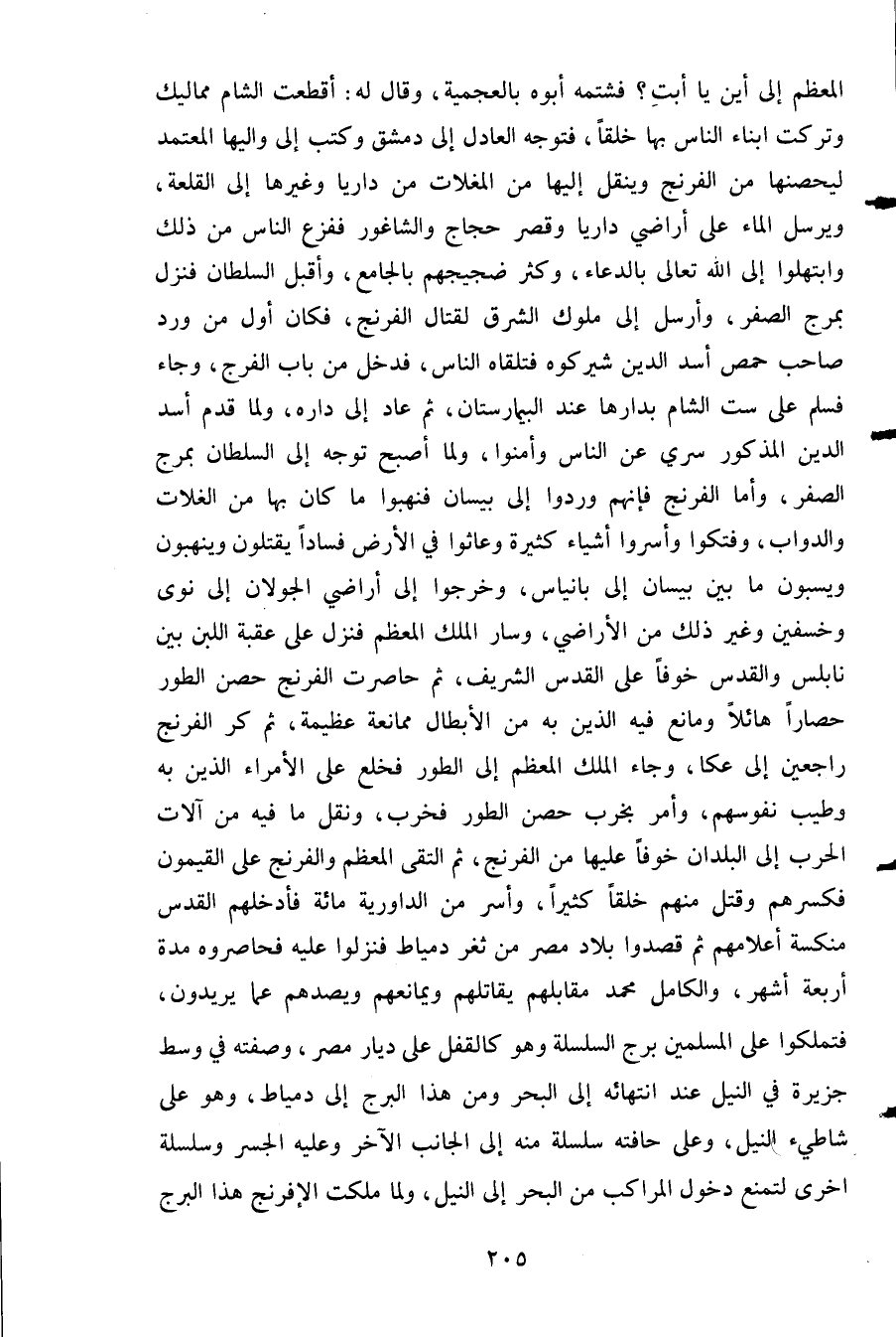 المعظم إلى أين يا أبت؟ فشتمه أبوه بالعجمية وقال له: أقطعت الشام مماليك وتركت أبناء الناس بها خلقا فتوجه العادل إلى دمشق وكتب إلى وليها المعتمد ليحصنها من الفرنج وينقل إليها من المغلات من داريا وغيرها إلى القلعة ويرسل الماء على أراضي داريا وقصر حجاج والشاغور ففزع الناس من ذلك وابتهلوا إلى الله تعالى بالدعاء وكثر ضجيجهم بالجامع وأقبل السلطان فنزل بمرج الصفر وأرسل إلى ملوك الشرق لقتال الفرنج فكان أول من ورد صاحب حمص أسد الدين شيركوه فتلقاه الناس فدخل من باب الفرج وجاء فسلم على ست الشام بدارها عند البيمارستان ثم عاد إلى داره ولما قدم أسد الدين المذكور سري عن الناس وأمنوا ولما أصبح توجه إلى السلطان بمرج الصفر وأما الفرنج فإنهم وردوا إلى بيسان فنهبوا ما كان بها من الغلات والدواب وفتكوا وأسروا أشياء كثيرة وعاثوا في الأرض فسادا يقتلون وينهبون ويسبون ما بين بيسان إلى بانياس وخرجوا إلى أراضي الجولان إلى نوى وخسفين وغير ذلك من الأراضي وسار الملك المعظم فنزل على عقبة اللبن بين نابلس والقدس خوفا على القدس الشريف ثم حاصرت الفرنج حصن الطور حصارا هائلا ومانع فيه الذين به من الأبطال ممانعة عظيمة ثم كر الفرنج راجعين إلى عكا وجاء الملك المعظم إلى الطور فخلع على الأمراء الذين به وطيب نفوسهم وأمر بخرب حصن الطور فخرب ونقل ما فيه من آلات الحرب إلى البلدان خوفا عليها من الفرنج ثم التقى المعظم والفرنج على القيمون فكسرهم وقتل منهم خلقا كثيرا وأسر من الداورية مائه فأدخلهم القدس منكسة أعلامهم ثم قصدوا بلاد مصر من ثغر دمياط فنزلوا عليه فحاصروه مدة أربعة أشهر والكامل محمد مقابلهم يقاتلهم ويمانعهم ويصدهم عما يريدون فتملكوا على المسلمين برج السلسلة وهو كالقفل على ديار مصر وصفته في وسط جزيرة في النيل عند انتهائه إلى البحر ومن هذا البرج إلى دمياط وهو على شاطيء النيل وعلى حافته سلسلة منه إلى الجانب الآخر وعليه الجسر وسلسلة أخرى لتمنع دخول المراكب من البحر إلى النيل ولما ملكت الآف رنج هذا البرج