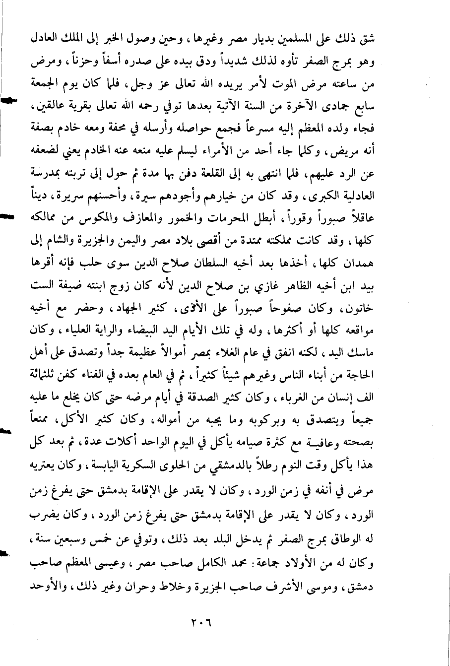 شق ذلك على المسلمين بديار مصر وغيرها وحين وصول الخبر إلى الملك العادل وهو بمرج الصفر تأوة لذلك شديدا ودق بيده على صدره أسفا وحزنا ومرض من ساعته مرض الموت لأمر يريده الله تعالى عز وجل فلما كان يوم الجمعة سابع جمادى الآخرة من السنة الآتية بعدها توفي رحمه الله تعالى بقرية عالقين فجاء ولده المعظم إليه مسرعا فجمع حواصله وأرسله في محفة ومعه خادم بصفة أنه مريض وكلما جاء أحد من الأمراء ليسلم عليه منعه عنه الخادم يعني لضعفه عن الرد عليهم فلما انتهى. به إلى القلعة دفن بها مدة ثم حول إلى تربته بمدرسة العادلية الكبرى وقد كان من خيارهم وأجودهم سيرة وأحسنهم سريرة دينا عاقلا صبورا وقورا أبطل المحرمات والخمور والمعازف والمكوس من ممالكه كلها وقد كانت مملكته ممتدة من أقصى بلاد مصر واليمن والجزيرة والشام إلى همدان كلها أخذها بعد أخيه السلطان صلاح الدين سوى حلب فإنه أقرها بيد ابن أخيه الظاهر غازي بن صلاح الدين لأنه كان زوج ابنته ضيفة الست خاتون وكان صفوحا صبورا على الأذى كثير الجهاد وحضر مع أخيه مواقعه كلها أو أكثرها وله في تلك الأيام اليد البيضاء والراية العلياء وكان ماسك اليد لكنه أنفق في عام الغلاء بمصر أموالا عظيمة جدا وتصدق على أهل الحاجة من أبناء الناس وغيرهم شيئا كثيرا ثم في العام بعده في الفناء كفن ثلثمائة ألف إنسان من الغرباء وكان كثير الصدقة في أيام مرضه حتى كان يخلع ما عليه جميعا ويتصدق به وبركوبه وما يحبه من أومواله وكان كثير الأكل ممتعا بصحته وعافيه مع كثير صيامه يأكل في اليوم الواحد أكلات عدة ثم بعد كل هذا ياكل وقت النوم رطلا بالدمشقي من الحلوى السكرية اليابسة وكان يعتريه مرض في أنفه في زمن الورد وكان لأي قدر على الإقامة بدمشق حتى يفرغ زمن الورد وكان لأي قدر على الإقامة بدمشق حتى يفرغ زمن الورد وكان يضرب له الوطاق بمرج الصفر ثم يدخل البلد بعد ذلك وتوفي عن خمس وسبعين سنة وكان له من الأولاد جماعة محمد الكامل صاحب مصر وعيسى المعظم صاحب دمشق وموسى الأشرف صاحب الجزيرة وخلاط وحران وغير ذلك والأوحد