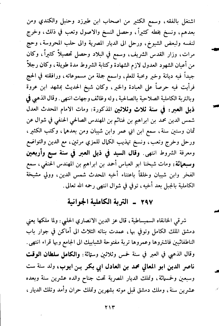 شرق الخناقاه السميساطية قال عز الدين الأنصاري الحلبي: ولما ملكها يعني دمشق الملك الكامل وتوفي بها عمدت بناته الثلاث إلى أماكن في جوار باب الناطفافئيين فاشتروها وعمروها تربة مفتوحة الشبابيك إلى الجامع وبها قراء انتهى. وقال الذهبي في العبر في سنة خمس وثلاثين وستمائة: والكامل سلطان الوقت ناصر الدين أبو المعالي محمد بن العادل أبي بكر بن أيوب ولد سنة ست وسبعين وخمسمائة وتملك الديار المصرية تحت جناح ولده عشرين سنة وبعده عشرين سنة وملك دمشق قبل موته بشهرين وتملك حران وأمد وتلك الديار