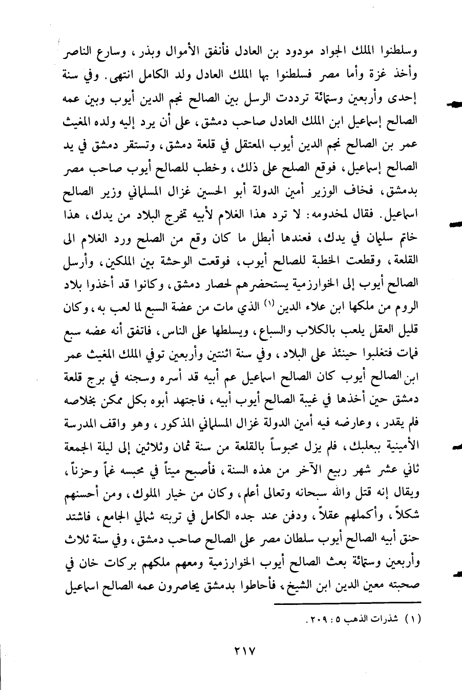 وسلطنوا الملك الجواد مودود بن العادل فأنفق الأموال وبذر وسارع الناصر وأخذ غزة وأما مصر فسلطنوا بها الملك العادل ولد الكامل انتهى. وفي سنة إحدى وأربعين وستمائة ترددت الرسل بين الصالح نجم الدين أيوب وبين عمه الصالح إسماعيل ابن الملك العادل صاحب دمشق على أن يرد إليه ولده المغيث عمر بن الصالح نجم الدين أيوب المعتقل في قلعة دمشق وتستقر دمشق في يد الصالح إسماعيل فوقع الصلح على ذلك وخطب للصالح أيوب صاحب مصر بدمشق فخاف الوزير أمين الدولة أبو الحسين غزال المسلماني وزير الصالح إسماعيل فقال لمخدومه: لا ترد هذا الغلام لأبيه تخرج البلاد من يدك هذا خاتم سليمان في يدك فعندها أبطل ما كان وقع من الصلح ورد الغلام إلى القلعة وقطعت الخطبة للصالح أيوب فوقعت الوحشة بين الملكين وأرسل الصالح أيوب إلى الخوارزمية يستحضرهم لحصار دمشق وكانوا قد أخذوا بلاد الروم من ملكها ابن علاء الدين1 الذي مات من عضة السبع لما لعب به وكان قليل العقل يلعب بالكلاب والسباع ويسلطها على الناس فاتفق أنه عضه سبع فمات فتغلبوا حينئذ على البلاد وفي سنة اثنتين وأربعين توفي الملك المغيث عمر ابن الصالح أيوب كان الصالح إسماعيل عم أبيه قد أسره وسجنه في برج قلعة دمشق حين أخذها في غيبة الصالح أيوب أبيه فاجتهد أبوه بكل ممكن بخلاصه فلم يقدر وعارضه فيه أمين الدولة غزال المسلماني المذكور وهو واقف المدرسة الأمينية ببعلبك فلم يزل محبوسا بالقلعة من سنة ثمان وثلاثين إلى ليلة الجمعة ثاني عشر شهر ربيع الآخر من هذه السنة فأصبح ميتا في محبسه غما وحزنا ويقال أنه قتل والله سبحانه وتعالى أعلم وكان من خيار الملوك ومن أحسنهم شكلا وأكملهم عقلا ودفن عند جده الكامل في تربته شمالي الجامع فاشتد حنق أبيه الصالح أيوب سلطان مصر على الصالح صاحب دمشق وفي سنة ثلاث وأربعين وستمائة بعث الصالح أيوب الخوارزمية ومعهم ملكهم بركات خان في صحبته معين الدين ابن الشيخ فاحاطوا بدمشق يحاصرون عمه الصالح إسماعيل