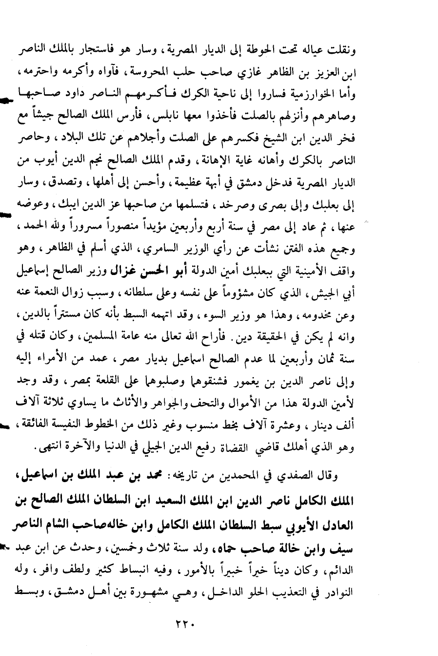 ونقلت عياله تحت الحوطة إلى الديار المصرية وسار هو فاستجار بالملك الناصر ابن العزيز ابن الظاهر غازي صاحب حلب المحروسة فأواه وأكرمه واحترمه وأما الخوارزمية فساروا إلى ناحية الكرك فأكرمهم الناصر داود صاحبها وصاهرهم وأنزلهم بالصلت فأخذوا معها نابلس فأرس الملك الصالح جيشا مع فخر الدين ابن الشيخ فكسرهم على الصلت وأجلاهم عن تلك البلاد وحاصر الناصر بالكرك وأهانه غاية الإهانة وقدم الملك الصالح نجم الدين أيوب من الديار المصرية فدخل دمشق في أبهة عظيمة وأحسن إلى أهلها وتصدق وسار إلى بعلبك وإلى بصرى وصرخد فتسلمها من صاحبها عز الدين أيبك وعوضه عنها ثم عاد إلى مصر في سنة أربع وأربعين مؤيدا منصورا مسرورا ولله الحمد وجميع هذه الفتن نشأت عن رأي الوزير السامري الذي أسلم في الظاهر وهو واقف الأمينية التي ببعلبك أمين الدوله أبو الحسن غزال وزير الصالح إسماعيل أبي الجيش الذي كان مشؤوما على نفسه وعلى سلط أنه وسبب زوال النعمة عنه وعن مخدومه وهذا هو وزير السوء وقد اتهمه السبط بأنه كان مستترا بالدين وأنه لم يكن في الحقيقة دين فأراح الله تعالى منه عامة المسلمين وكان قتله في سنة ثمان وأربعين لما عدم الصالح إسماعيل بديار مصر عمد من الأمراء إليه والى ناصر الدين بن يغمور فشنقوهما وصلبوهما على القلعة بمصر وقد وجد لأمين الدوله هذا من الأموال والتحف والجواهر والأثاث ما يساوي ثلاثة الآف ألف دينار وعشرة الآف بخط منسوب وغير ذلك من الخطوط النفيسه الفائقة وهو الذي أهلك قاضي القضاة رفيع الدين الجيلي في الدنيا والآخرة انتهى.