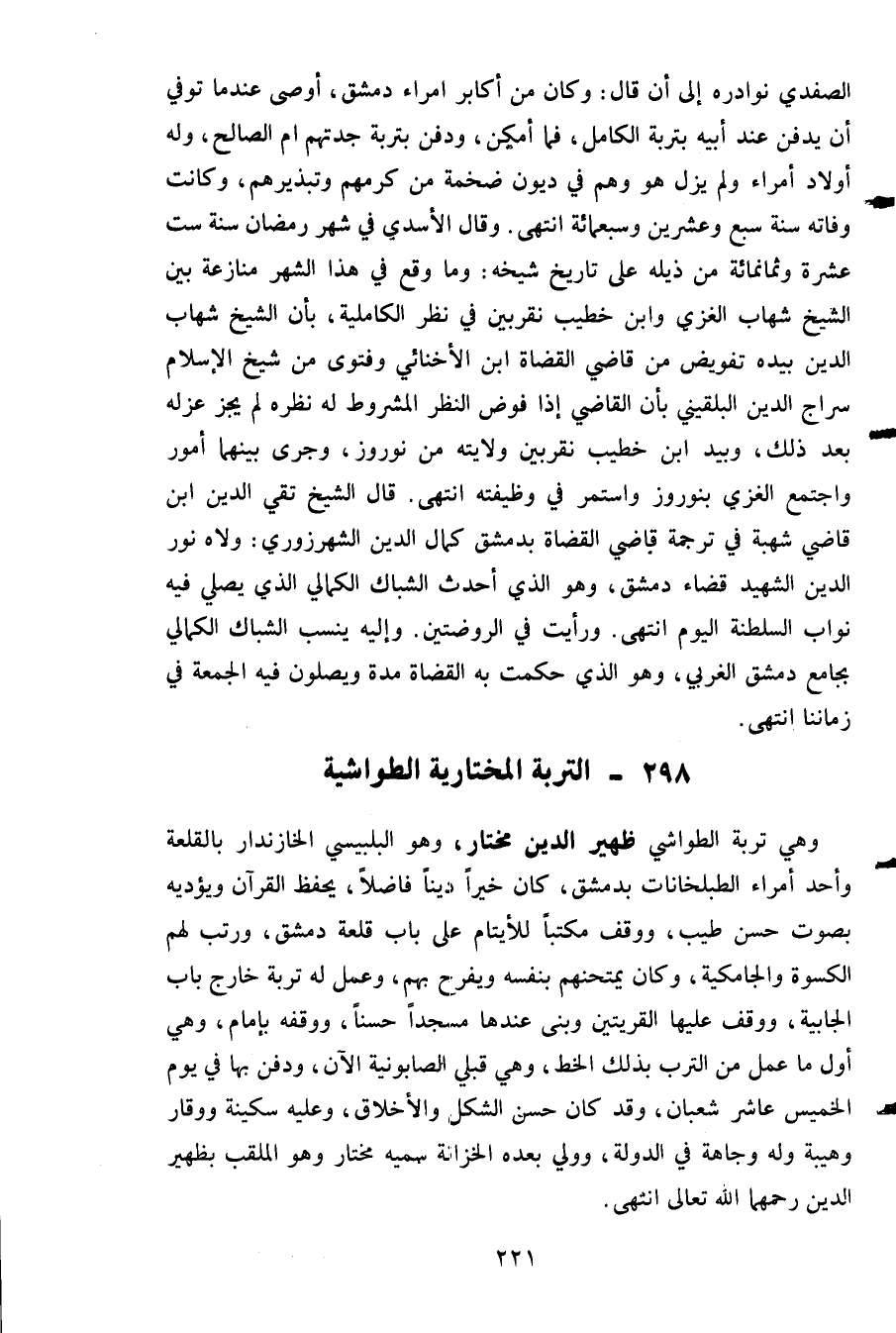 الصفدي نوادره إلى أن قال: وكان من أكابر أمراء دمشق أوصى عندما توفي أن يدفن عند أبيه بتربة الكامل فما أمكن ودفن بتربة جدتهم أم الصالح وله أولاد أمراء ولم يزل هو وهم في ديون ضخمة من كرمهم وتبذيرهم وكانت وفاته سنة سبع وعشرين وسبعمائة انتهى. وقال الأسدي في شهر رمضان سنة ست عشرة وثمانمائة من ذيله على تاريخ شيخه: وما وقع في هذا الشهر منازعة بين الشيخ شهاب الغزي وابن خطيب نقربين في نظر الكاملية بأن الشيخ شهاب الدين بيده تفويض من قاضي القضاة ابن الاخنائي وفتوى من شيخ الإسلام سراج الدين البلقيني بأن القاضي إذا فوض النظر المشروط له نظره لم يجز عزله بعد ذلك وبيد ابن خطيبب نقربين ولايته من نوروز وجرى بينهما أمور واجتمع الغزي بنوروز واستمر في وظيفته انتهى. قال الشيخ تقي الدين ابن قاضي شهبة في ترجمة قاضي القضاة بدمشق كمال الدين الشهرزوري: ولاه نور الدين الشهيد قضاء دمشق وهو الذي أحدث الشباك الكمالي الذي يصلي فيه نواب السلطنة اليوم انتهى. ورأيت في الروضتين وإليه ينسب الشباك الكمالي بجامع دمشق الغربي وهو الذي حكمت به القضاة مدة ويصلون فيه الجمعة في زماننا انتهى.