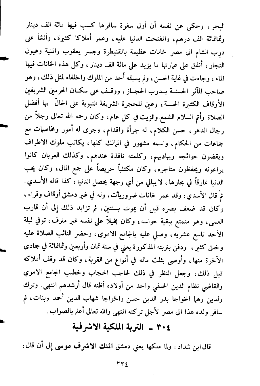 البحر وحكى عن نفسه أن أول سفرة سافرها كسب فيها مائة ألف دينار وثمانمائة ألف درهم وانفتحت الدنيا عليه وعمر أملاكا كثيرة وأنشأ على درب الشام إلى مصر خانات عظيمة بالقنيطرة وجسر يعقوب والمنية وعيون التجار وأنفق على عمارتها مايزيد على مائة ألف دينار وكل هذه الخانات فيها الماء وجاءت في غاية الحسن ولم يسبقه أحد من الملوك والخلفاء لمثل ذلك وهو صاحب المآثر الحسنة بدرب الحجاز ووقف على سكان الحرمين الشريفين الأوقاف الكثيرة الحسنة وعين للحجرة الشريفة النبوية على الحال بها أفضل الصلاة وأتم السلام الشمع والزيت في كل عام وكان رحمه الله تعالى رجلا من رجال الدهر حسن الكلام له جرأة وأقدام وجرى له أمور ومخاصمات مع جماعات من الحكم واسمه مشهور في الممالك كلها يكاتب ملوك الأطراف ويقضون حوائجه ويهاديهم وكلمته نافذة عندهم وكذلك العربان كانوا يراعونه ويحفظون متاجرة وكان مكتئبا حريصا على جمع المال وكان يحب الدنيا غارقا في بحارها لا يبالي من أي وجهة يحصل الدنيا كذا قال الأسدي. ثم قال الأسدي: وقد عمر خانات ضروريات وله في غير دمشق أوقاف وقراء وكان قد ضعف بصره قبل أن يموت بسنتين ثم تزايد ذلك إلى أن قارب العمى وهو متمتع ببقية حواسه وكان بخيلا على نفسه غير مترف توفي ليلة الأحد تاسع عشريه وصلي عليه بالجامع الأموي وحضر النائب الصلاة عليه خلق كثير ودفن بتربته المذكورة يعني في سنة ثمان وأربعين وثمانمائة في جمادى الآخرة منها وأوصى بثلث ماله في أنواع من القربة وكان قد وقف أملاكه قبل ذلك وجعل النظر في ذلك لحاجب الحجاب وخطيب الجامع الأموي والقاضي نظام الدين الحنفي واحد من أولاده أظنه قال: أرشدهم انتهى. وترك ولدين وهما الخواجا بدر الدين حسن والخواجا شهاب الدين أحمد وبنات ثم سافر ولده هذا إلى مصر لأجل تركته انتهى والله تعالى أعلم بالصواب.