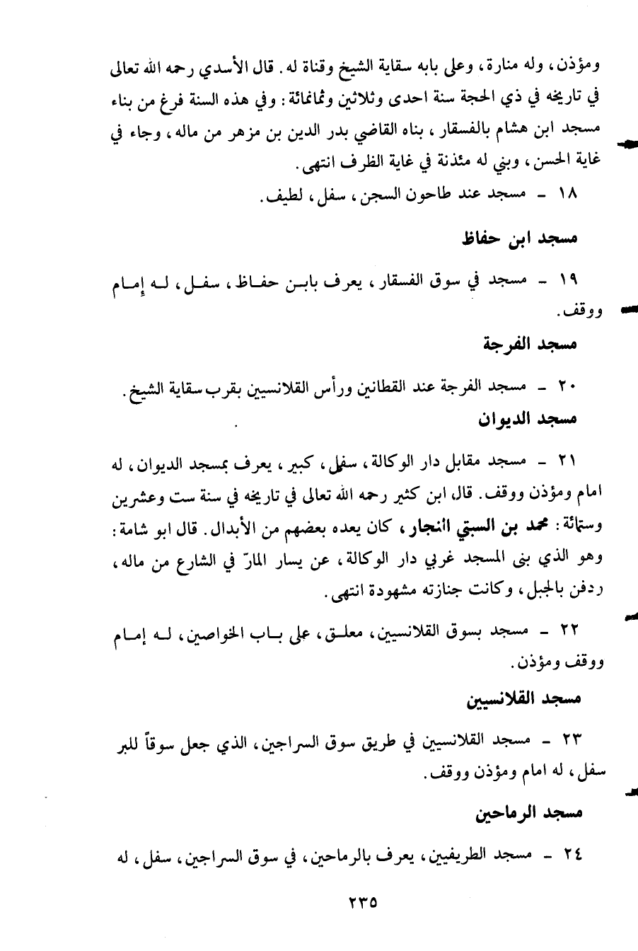 23- مسجد القلانسيين في سوق السراجين الذي جعل سوقا للبر سفل له إمام ومؤذن ووقف.