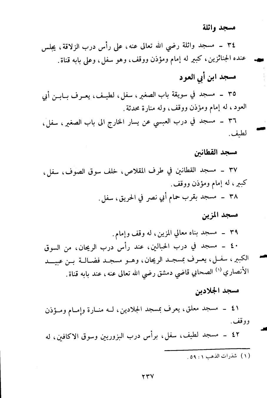 34- مسجد واثله رضي الله تعالى عنه على رأس درب الزلاقة يجلس عنده الجنائزين كبير له إمام ومؤذن ووقف وهو سفل وعلى بابه قناة.