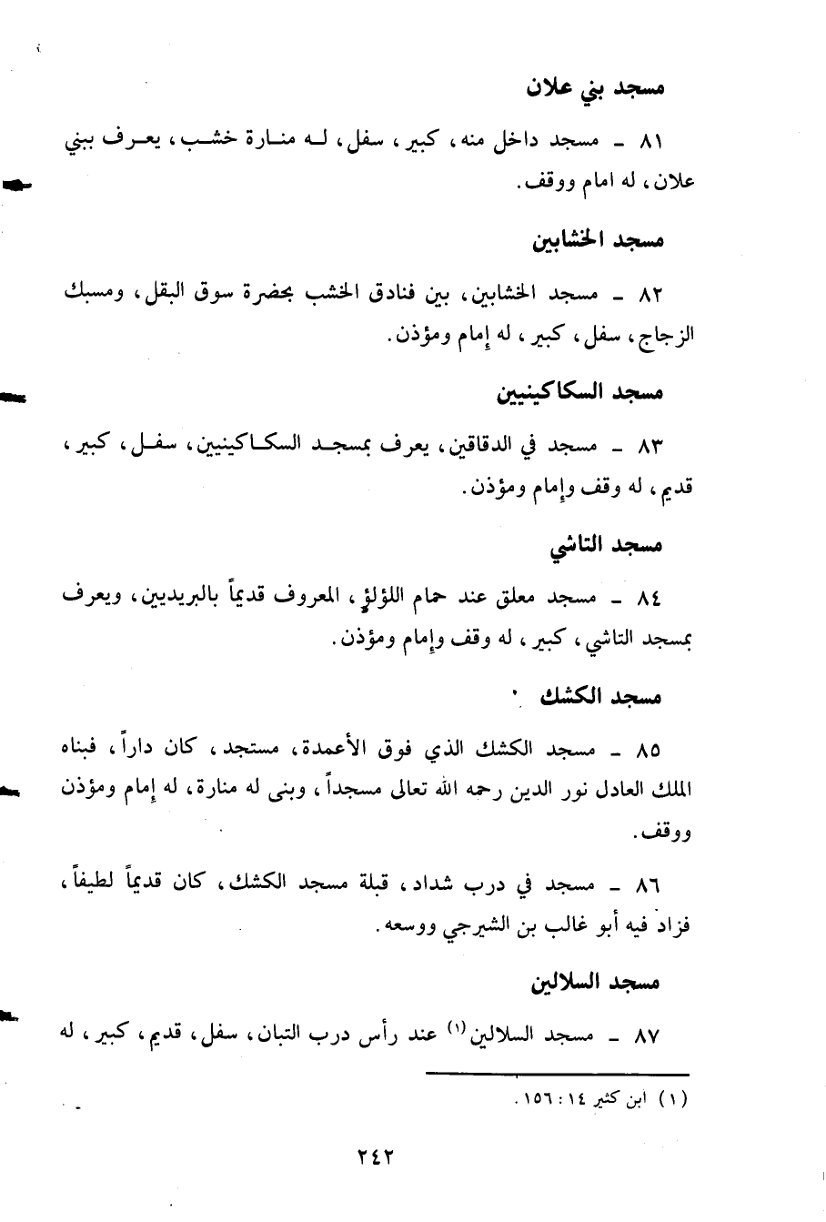82- مسجد الخشابين بين فنادق الخشب بحضرة سوق البقل ومسبك الزجاج سفل كبير له إمام ومؤذن.