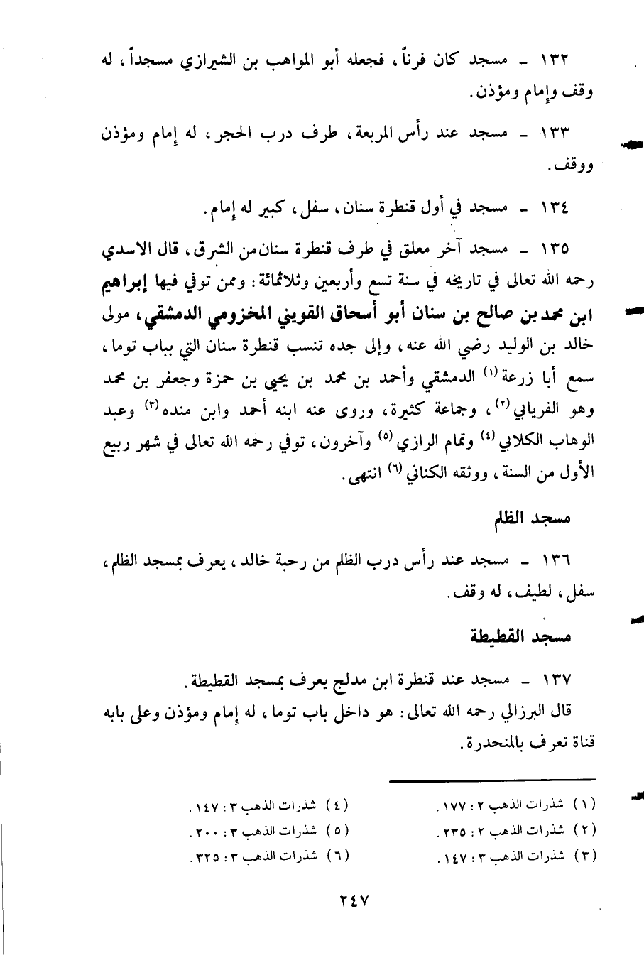 135- مسجد آخر معلق في طرف قنطرة سنان من الشرق قال الأسدي رحمه الله تعالى في تاريخه في سنة تسع وأربعين وثلاثمائة: وممن توفي فيها إبراهيم ابن محمد بن صالح بن سنان أبو إسحاق القويني المخزومي الدمشقي مولى خالد بن الوليد رضى الله عنه وإلى جده تنسب قنطرة سنان التي بباب توما سمع أبا زرعة1 الدمشقي وأحمد بن محمد بن يحيى بن حمزة وجعفر بن محمد وهو الفريابي2 وجماعة كثيرة وروى عنه ابنه أحمد وابن منده3 وعبد الوهاب الكلابي4 وتمام الرازي5 وآخرون توفي رحمه الله تعالى في شهر ربيع الأول من السنة ووثقه الكناني6 انتهى.