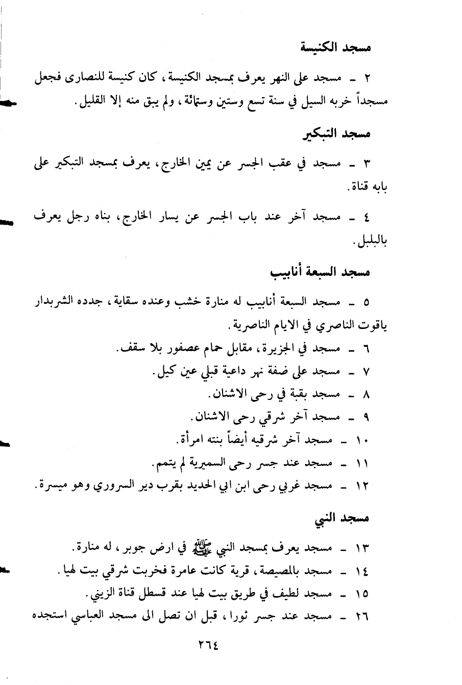 2- مسجد على النهر يعرف بمسجد الكنيسة كان كنيسة للنصارى فجعل مسجدا خربه السيل في سنة تسع وستين وستمائة ولم يبق منه إلا القليل.