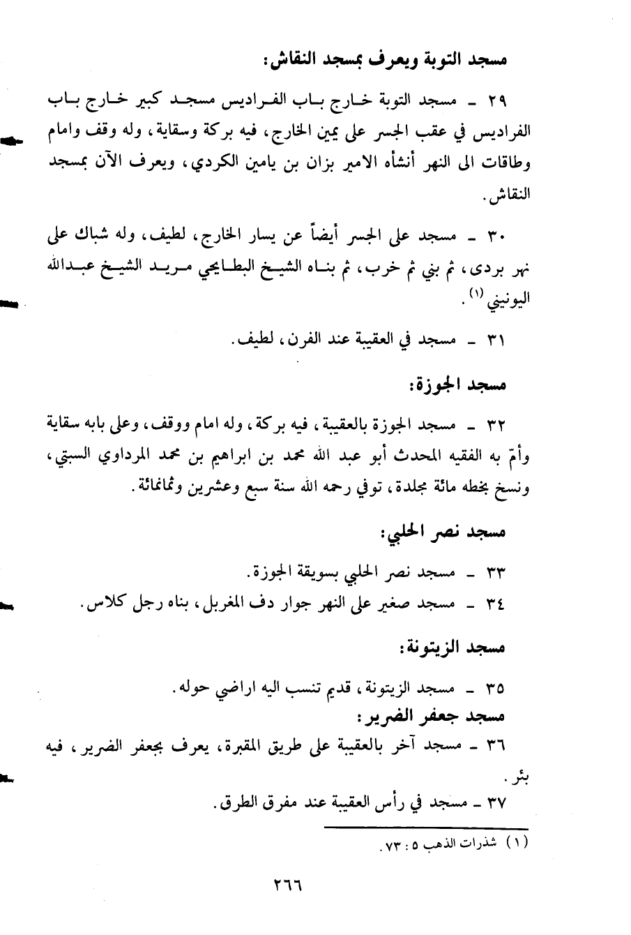29- مسجد التوبة خارج باب الفراديس مسجد كبير خارج باب الفراديس في عقب الجسر على يمين الخارج فيه بركة وسقاية وله وقف وإمام وطاقات إلى النهر أنشأه الأمير بزان بن يامين الكردي ويعرف الآن بمسجد النقاش.