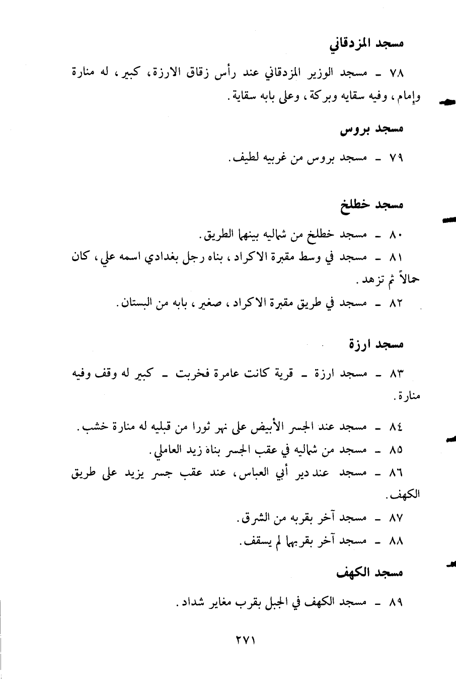 81- مسجد في وسط مقبرة الأكراد بناه رجل بغدادي اسمه علي كان حمالا ثم تزهد. 82- مسجد في طريق مقبرة الأكراد صغير بابه من البستان.