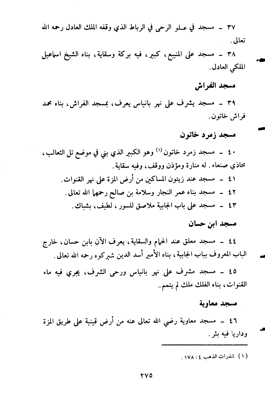 44- مسجد معلق عند الحمام والسقاية يعرف الآن بابن حسان خارج الباب المعروف بباب الجابية بناه الأمير أسد الدين شيركوه رحمه الله تعالى.