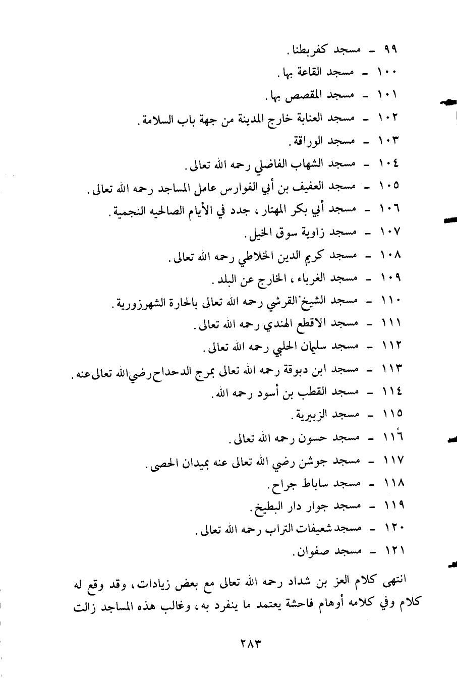 انتهى كلام العز بن شداد رحمه الله تعالى مع بعض زيادات وقد وقع له كلام وفي كلامه أوهام فاحشة يعتمد ما ينفرد به وغالب هذه المساجد زالت