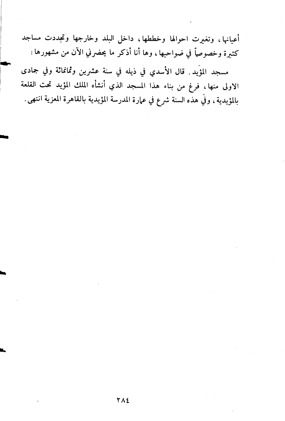 مسجد المؤيد. قال الأسدي في ذيله في سنة عشرين وثمانمائة وفي جمادى الأولى منها فرغ من بناء هذا المسجد الذي أنشأه الملك المؤيد تحت القلعة بالمؤيدية وفي هذه السنة شرع في عمارة المدرسة المؤيدية بالقاهرة المعزية انتهى.